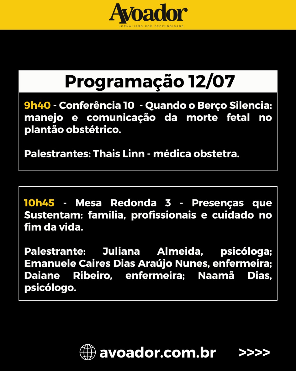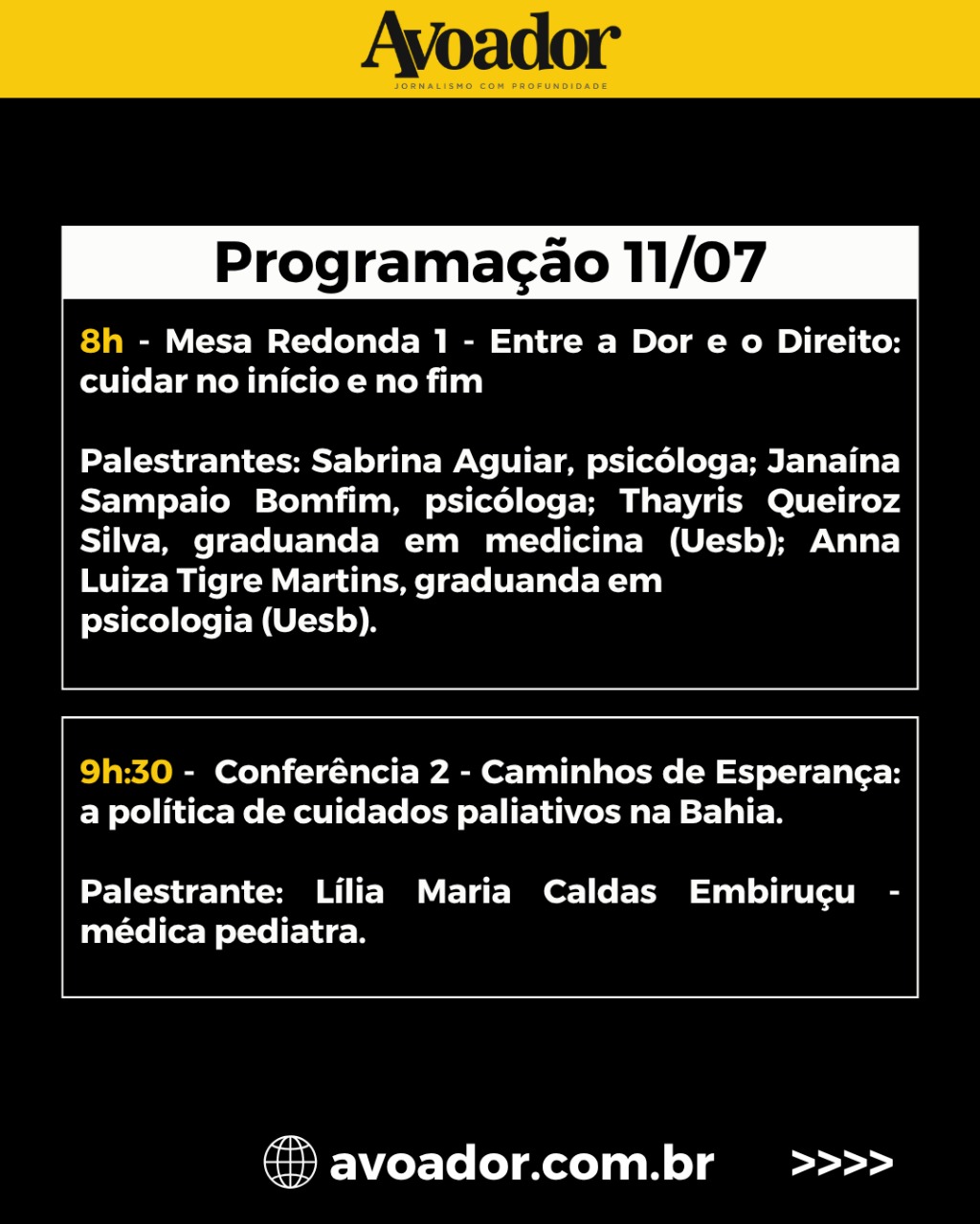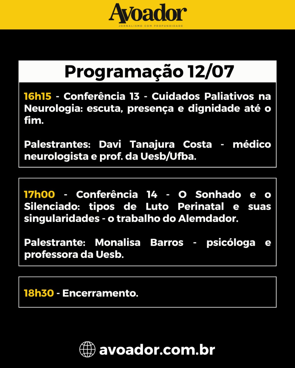 O evento acontece em três dias, entre 10 e 12 de julho, e é aberto ao público 9 de julho de 2025 Rian Borges*Nesta quinta-feira (10/07), a partir das 19h, no Teatro Glauber Rocha da Universidade Estadual do Sudoeste da Bahia (Uesb), será realizada a abertura do I Seminário de Cuidados Paliativos e Luto Perinatal do Sudoeste da Bahia. O evento acontece em três dias, entre 10 e 12 de julho, e é aberto ao público.