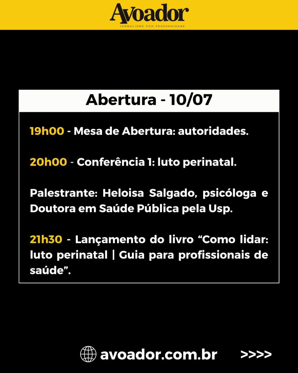 Em seguida, às 20h, será realizada a “Conferência 1: luto perinatal”, com a presença da psicóloga e doutora em Saúde Pública pela Universidade de São Paulo (USP), Heloisa Salgado, e da professora da Uesb, e também psicóloga, Monalisa Barros. Depois da Conferência, às 21h30, Heloisa Salgado lançará o seu livro “Como lidar: luto perinatal. Guia para profissionais de saúde”, fechando as atividades da noite.