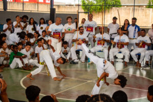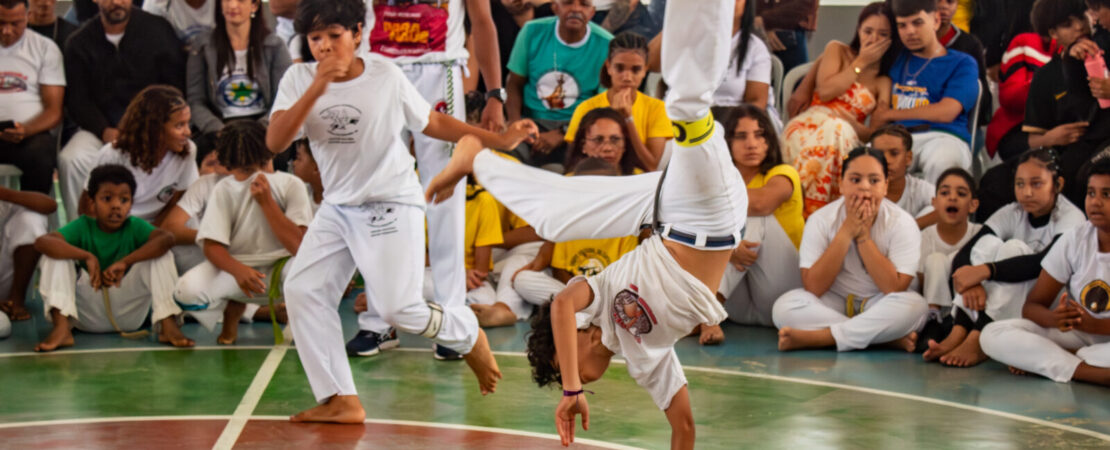 Meninos jogando capoeira enquanto o público e os participantes observam e aplaudem. Foto: Francisco Schettini
