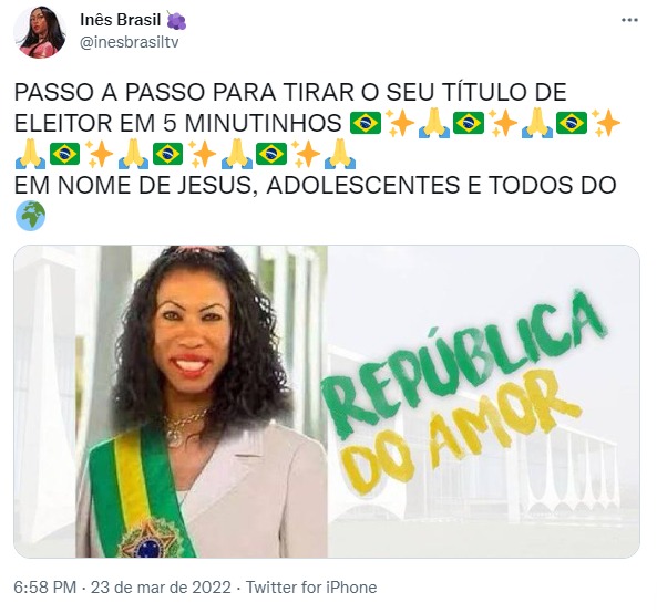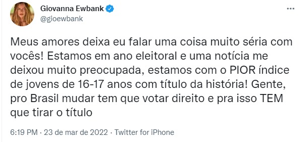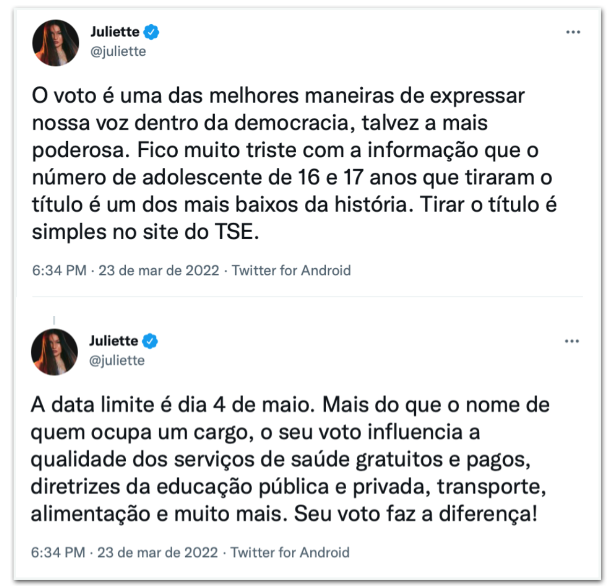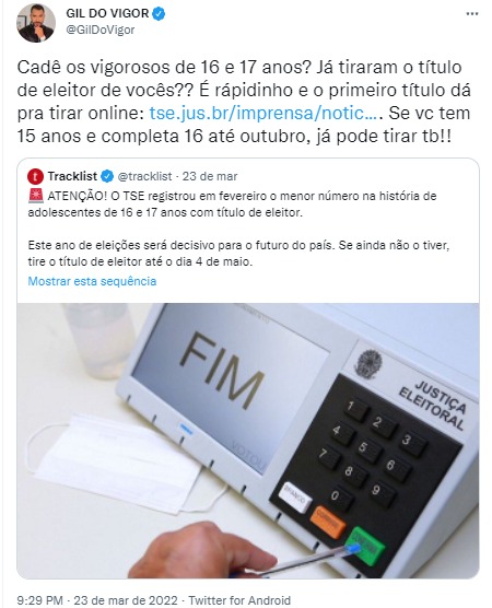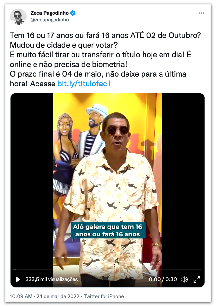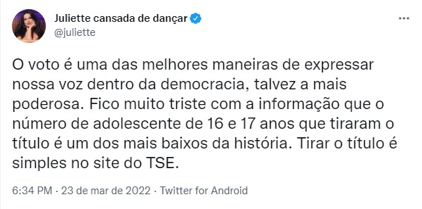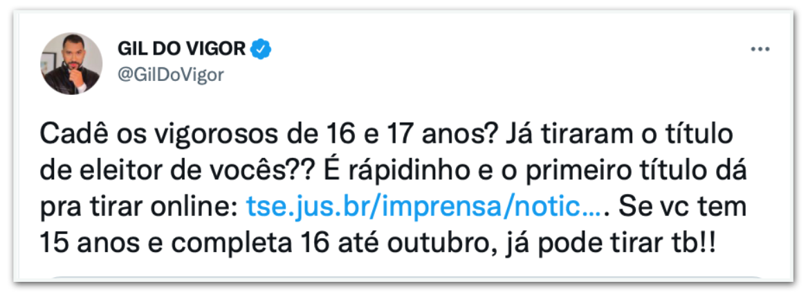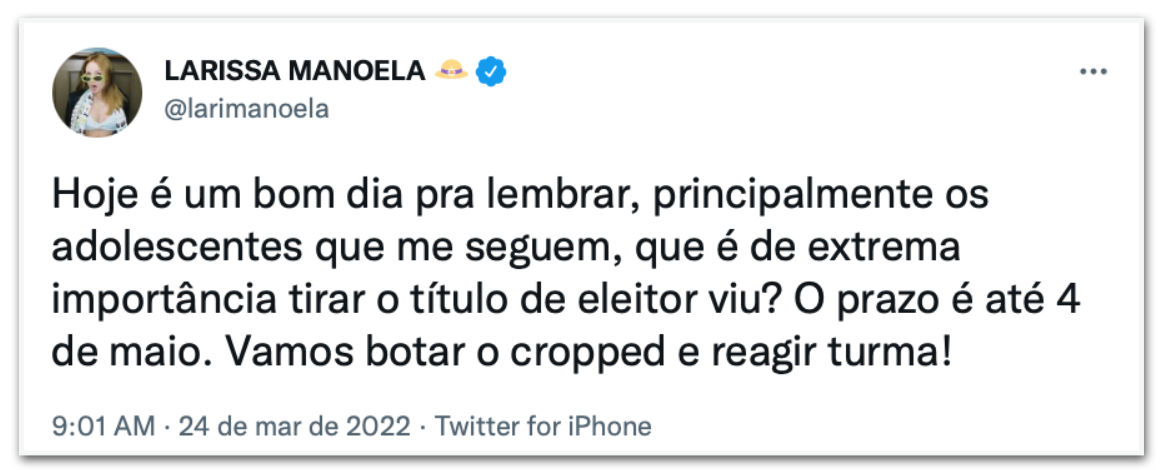 “Tem 16 ou 17 anos ou fará 16 anos ATÉ 02 de Outubro? Mudou de cidade e quer votar para o novo presidente do Brasil? Então, fique sabendo que é muito fácil tirar ou transferir o título hoje em dia! É tudo online e não precisa de biometria!”, postou no twitter a cantora Anitta, no dia 23 de março. A publicação da dona do hit Envolver, que alcançou o Top #1 global do Spotify, foi compartilhada até pelo ator norte-americano Mark Ruffalo, conhecido pelo personagem Matt, do filme De Repente 30 (2004), e por interpretar o super-herói Hulk nos filmes da Marvel.