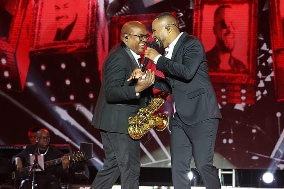 - Alexandre Pires faz brincadeira no palco com o seu parceiro de grupo. Foto: Laécio Lacerda.