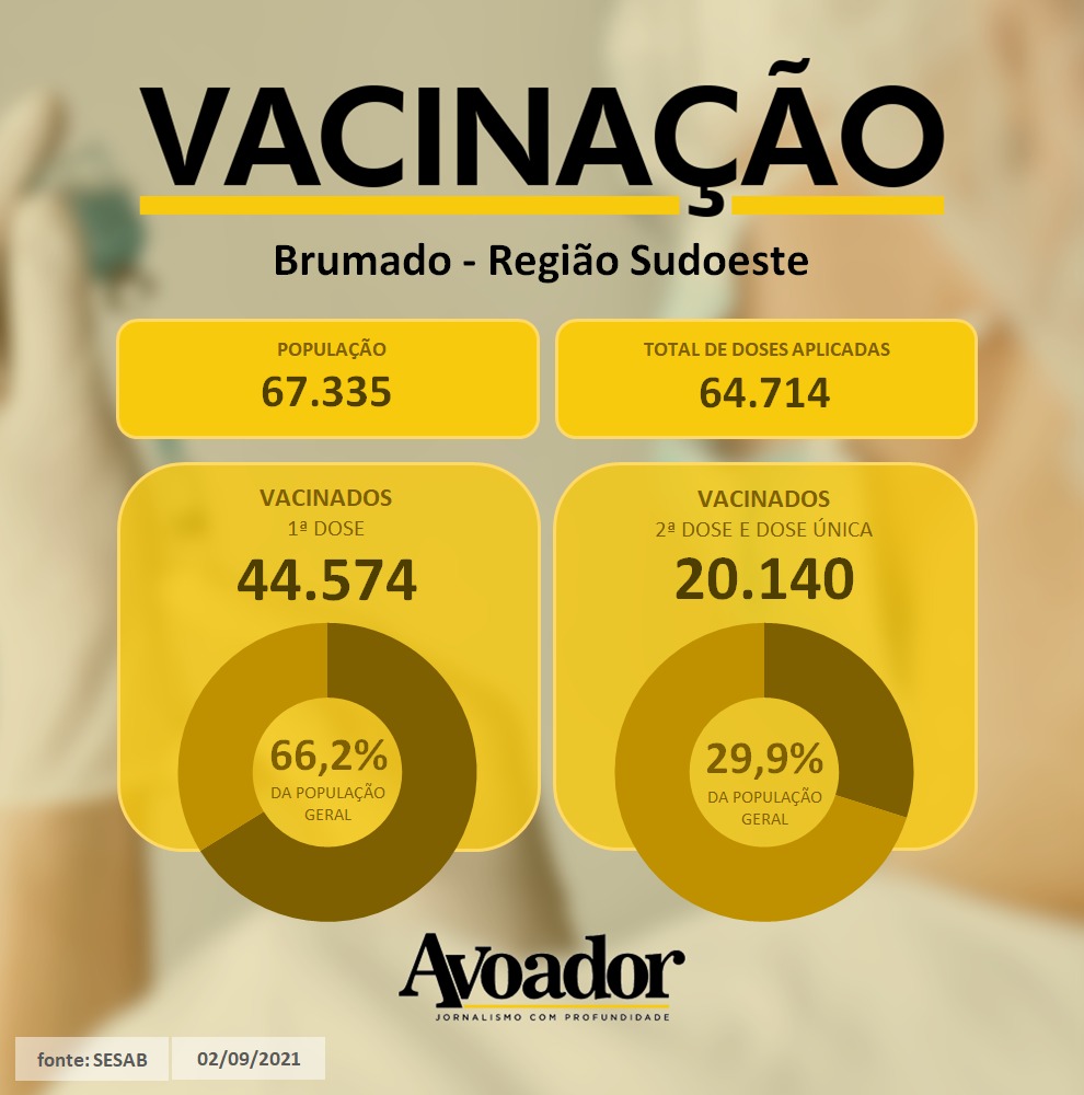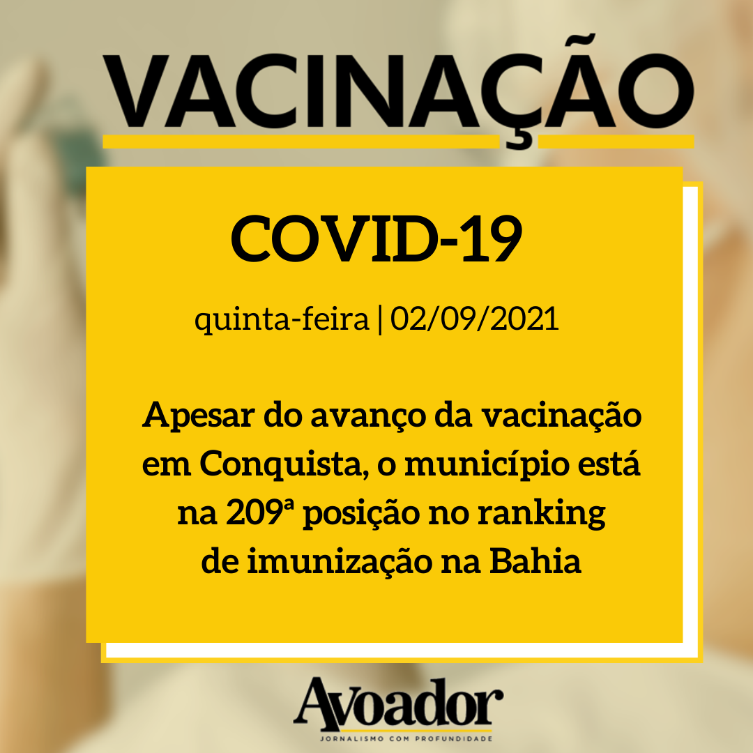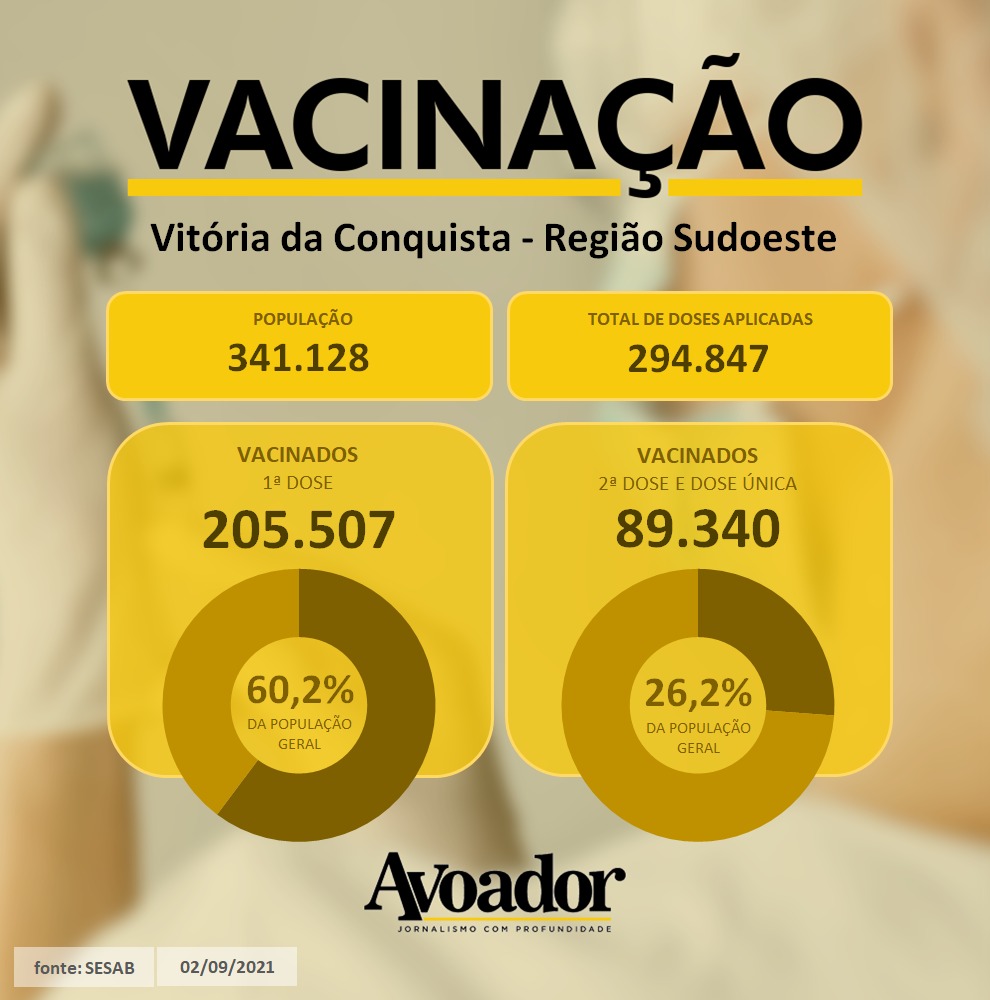 Acompanhe abaixo os dados da vacinação em Vitória da Conquista e em cidades da região Sudoeste e Sul, desde o início da aplicação até hoje (02/09).