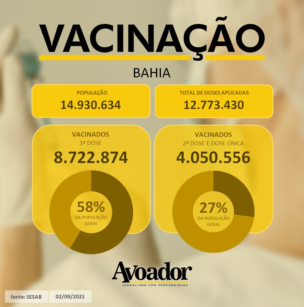 Desde que a campanha de vacinação contra a covid-19 teve início no Brasil, em janeiro de 2021, a Bahia vacinou 8.722.874 pessoas com a primeira aplicação. 3.795.587 receberam também a segunda dose, necessária para desenvolver a imunidade contra o coronavírus. E 261.050 foram vacinadas com dose única, que desenvolve a imunidade após 15 dias da aplicação. Até as 17 horas desta quinta-feira (02/09), a Bahia já vacinou mais de 80% da população baiana com 18 anos ou mais com, pelo menos, a primeira dose ou com a vacina de dose única.