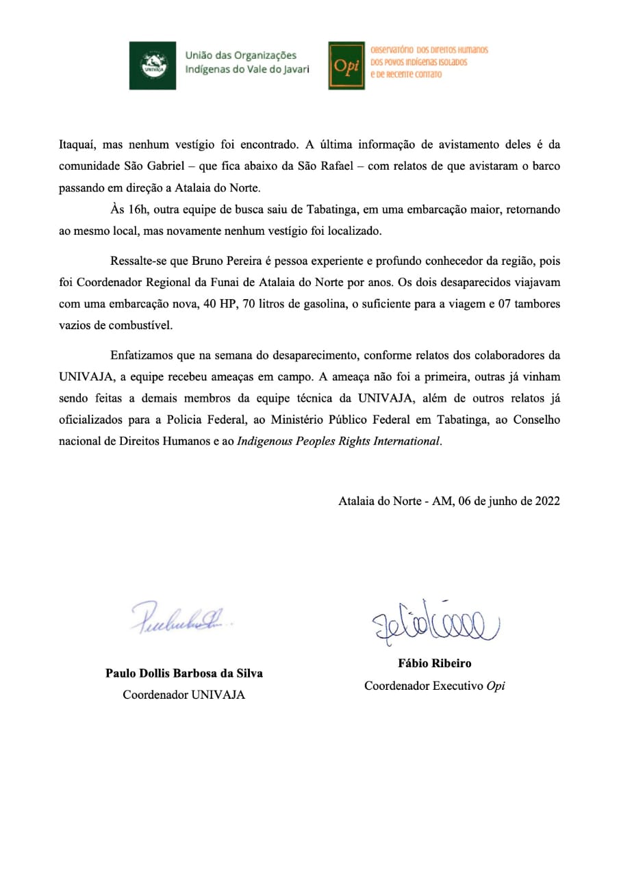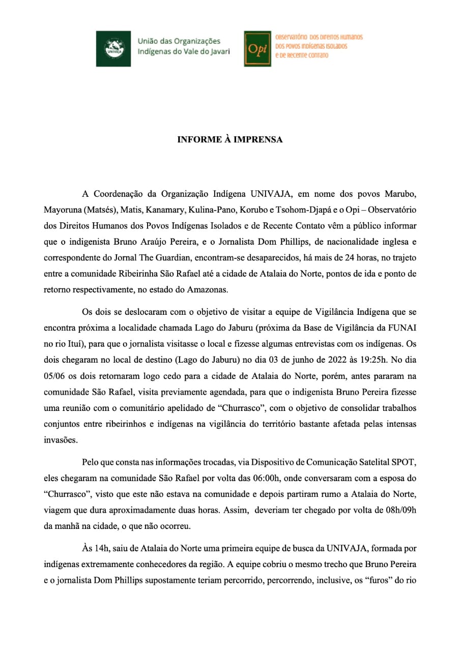- Nota publicada ontem (06/06) pelas entidades Univaja e OPI informando o desaparecimento de Bruno Pereira e Dom Phillips