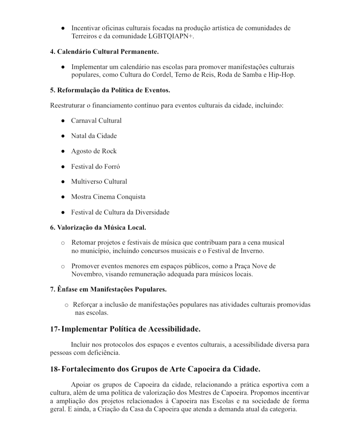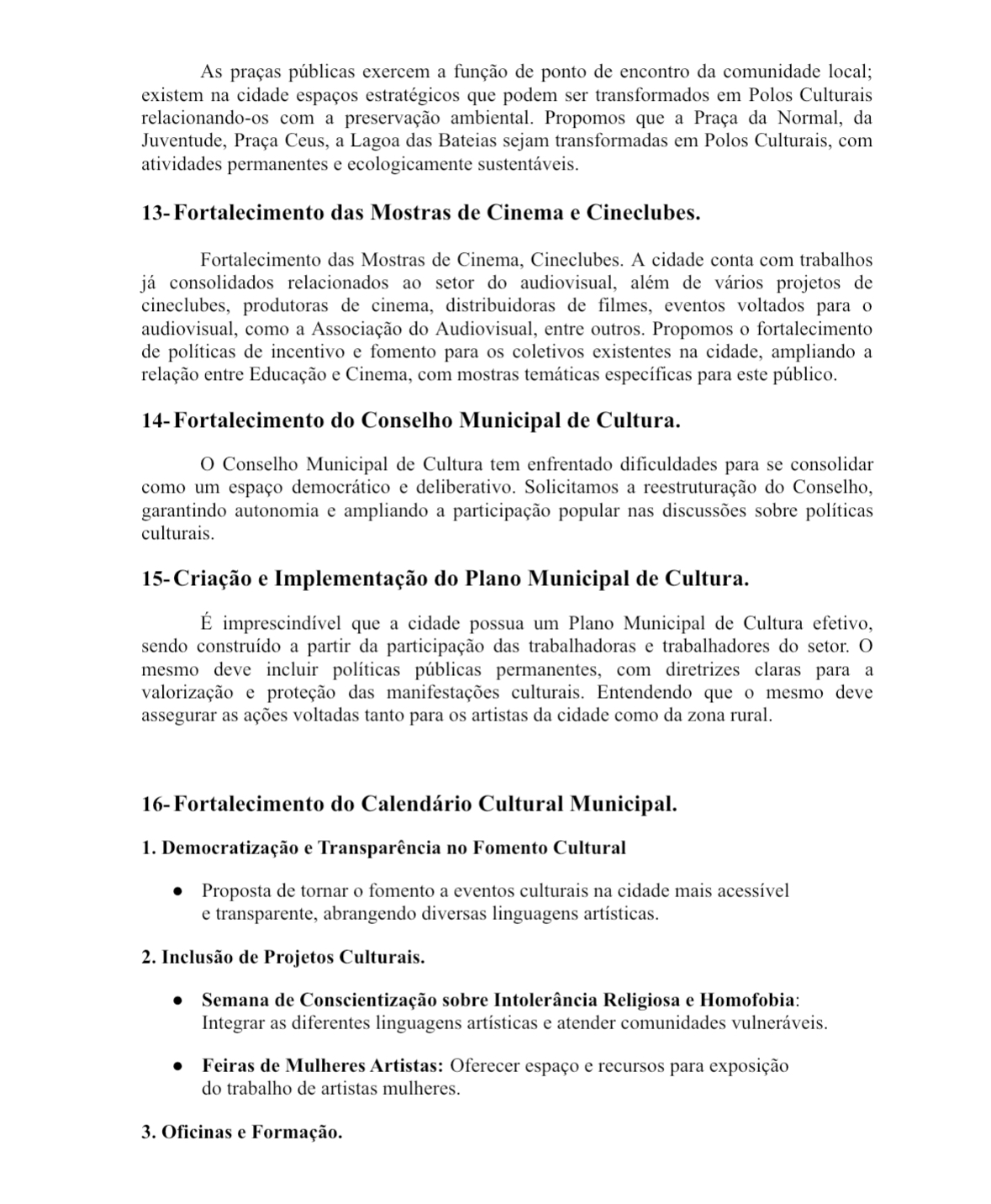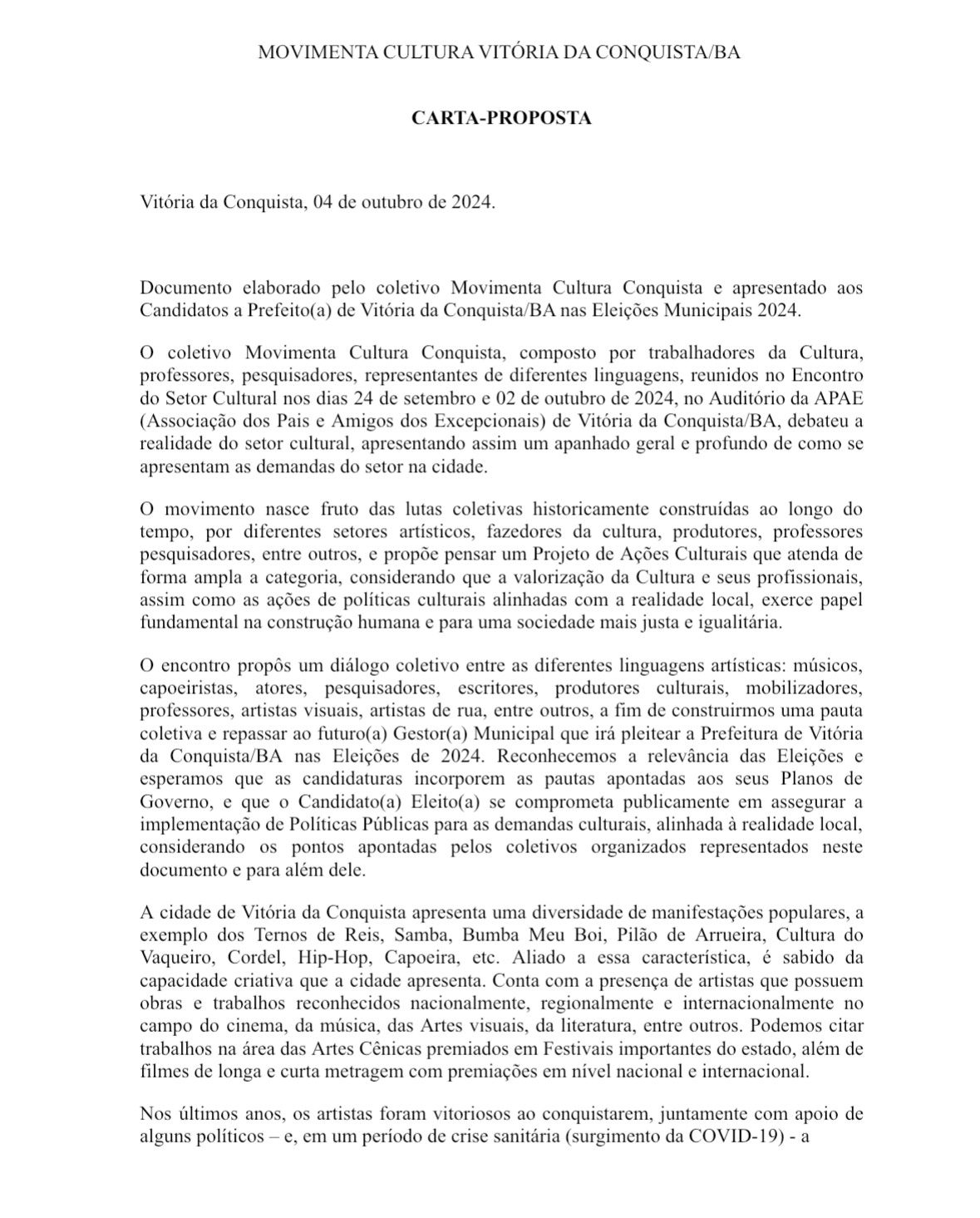Segundo a professora, atriz e produtora cultural Dayse Maria, a Carta-Proposta, que contém 20 propostas culturais para Conquista, surgiu da necessidade de diagnosticar a realidade do setor cultural da cidade. O documento foi construído a partir de debates sobre políticas públicas, impactos da pandemia, condições dos trabalhadores da cultura e a ausência de propostas concretas para a cultura nas eleições municipais de 2024. “Nos debates entre os candidatos, não se falava de cultura. Houve pouca ou quase nenhuma escuta real dos artistas da cidade durante o período de disputa; então, decidimos expor nossa indignação.”