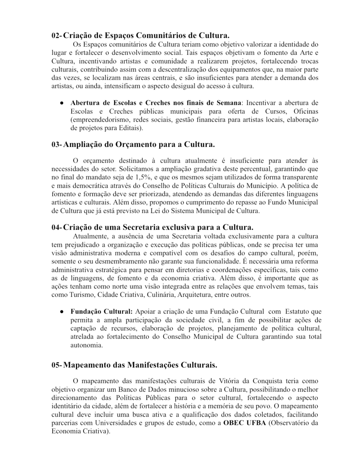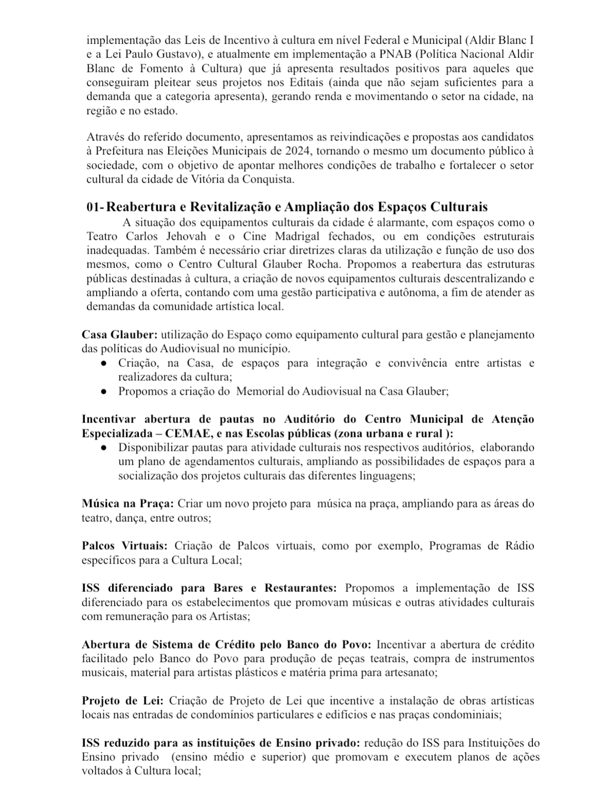 Para a artista e membro da comissão de elaboração da carta, Larissa Caldeira, Conquista é uma cidade rica em arte, mas com uma carência de espaços adequados para atender à diversidade artística local. “A cultura é a identidade de um povo, e nós não podemos deixar que a identidade cultural de Vitória da Conquista morra.”