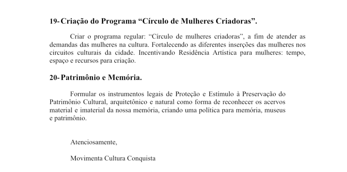 Outra artista participante do movimento foi Carolina Medrado. Ela explica que a carta contém informações sobre a cultura local e o que é necessário para melhorá-la e torná-la acessível a mais pessoas. “Nós esperamos que, com esta carta nas mãos do poder executivo, possamos ser ouvidos e contemplados.”