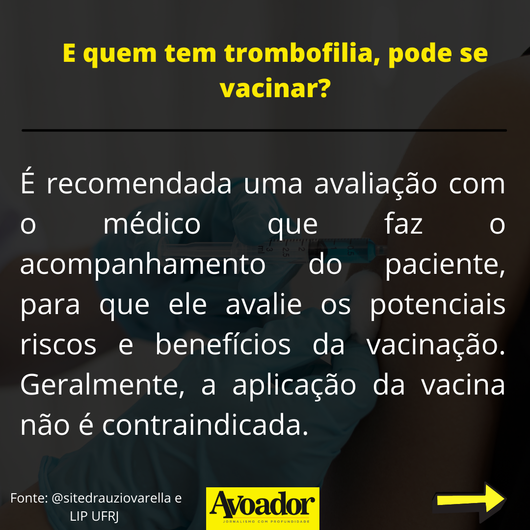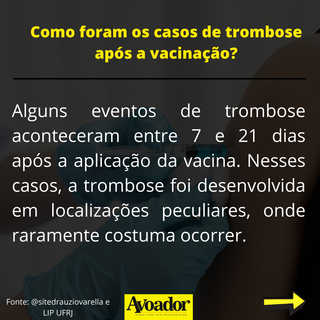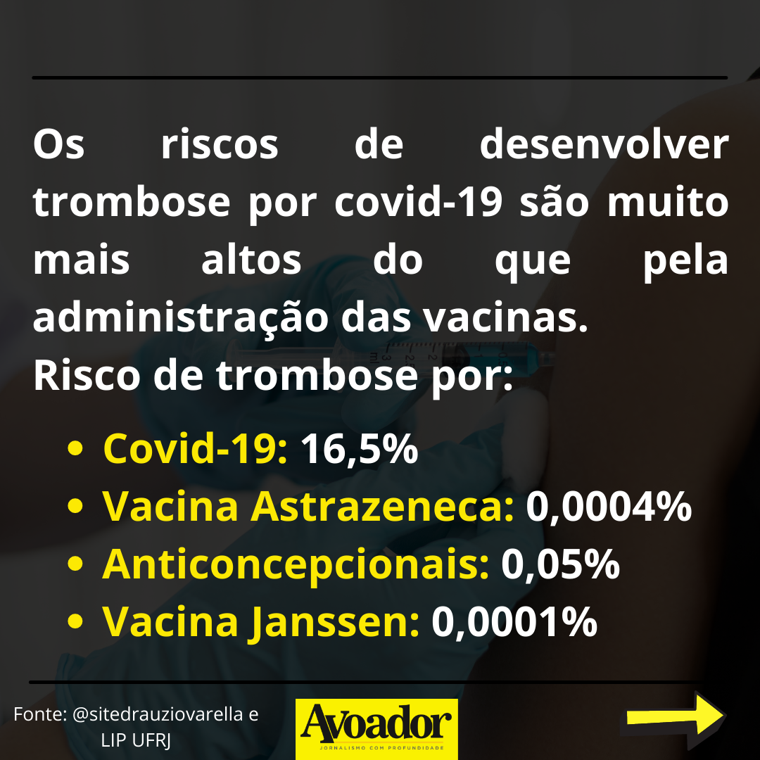 O risco para trombose existe, mas é considerado extremamente raro 26 de julho de 2021 Ariane LongaApesar das diferentes abordagens, todas as vacinas contra a covid-19 têm o mesmo objetivo: imunizar a população. Qualquer vacina, seja ela qual for, causará algum tipo de efeito colateral em quem toma.