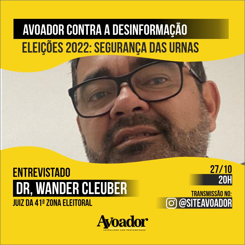 No dia 27 de outubro, quinta-feira, o entrevistado será o o juiz da 41ª Zona Eleitoral do Tribunal Eleitoral da Bahia, Wander Cleuber Oliveira Lopes. Ele vai tratar do tema “Desinformação e Urnas Eletrônicas”. Ele é formado em Direito pela Universidade Federal da Bahia em 1992 e entrou na magistratura em 1996. Atua na comarca de Vitória da Conquista desde agosto de 2009.