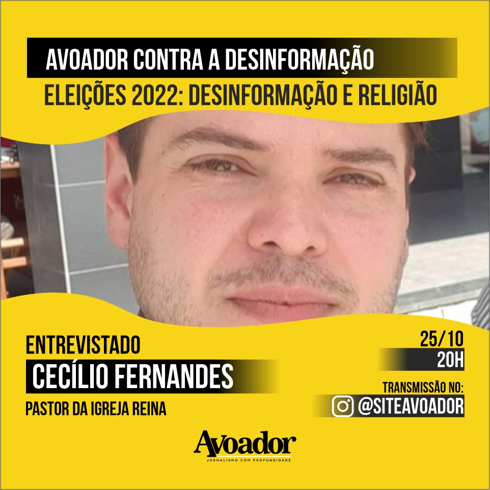 24 de outubro de 2022 Victória Meira AmaralNa semana que antecede o segundo turno das Eleições 2022, o Avoador preparou uma série de lives “Avoador contra a Desinformação” com convidados que irão discutir as informações falsas no meio religioso, político e jornalístico e relacionadas às urnas eletrônicas. Serão quatro lives transmitidas pelo instagram @siteavoador, de 25 a 28 de outubro, e todas começarão às 20h.