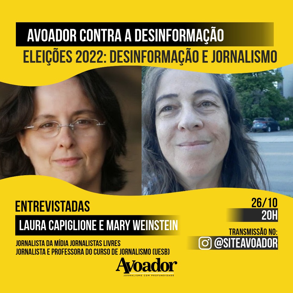 Na quarta-feira (26/10), a live vai discutir a desinformação e o jornalismo com as jornalistas Mary Weinstein e Laura Capriglione. A primeira é doutora em Cultura e Sociedade pela Ufba, com pós-doutorado em Arquitetura e Urbanismo pela Universidade Federal Fluminense (UFF). Ela também é professora de Jornalismo da Uesb e dos programas de pós-graduação em Ensino (Uesb) e Museologia (Ufba). Foi repórter no jornal A Tarde, tendo sido proponente e autora de séries de matérias que defendiam Salvador da especulação imobiliária. Já a segunda convidada, atuou como jornalista nas redações da Folha de S.Paulo (SP), Notícias Populares (SP), Editora Abril (revista Viva Mais Veja) e no Núcleo de Revistas Femininas da Editora Globo (revistas Marie Claire, Criativa, Casa & Jardim e Crescer). Também é uma das jornalistas responsáveis pelo projeto Ponte Jornalismo e é uma das criadoras da organização da Mídia Jornalistas Livres, a qual faz parte até os dias atuais.