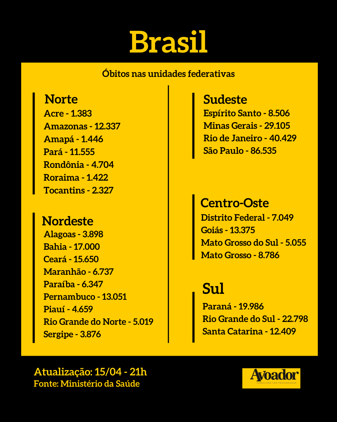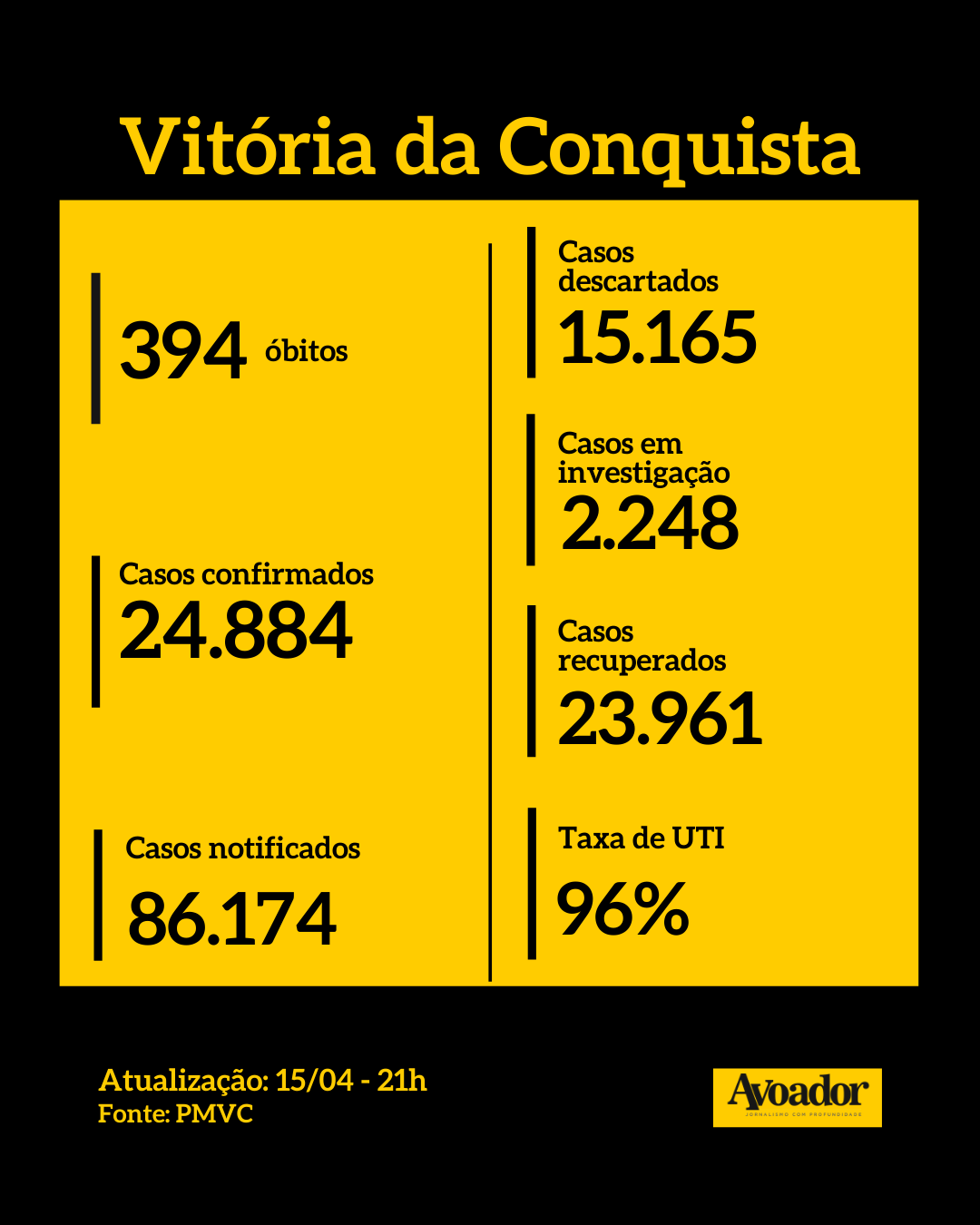 Em Conquista, foram dois homens e uma mulher mortos pela covid-19. O primeiro e segundo óbitos masculinos tinham 78 e 76 anos. O mais velho foi internado no dia 31 de março no Hospital Geral de Vitória da Conquista (HGVC), onde faleceu no dia 13 de abril e o segundo também foi internado no HGVC, no dia 12 de abril, onde morreu ontem (14/04). A mulher de 70 anos, internada também no HGVC, no dia 2 de abril, faleceu hoje (15/04).