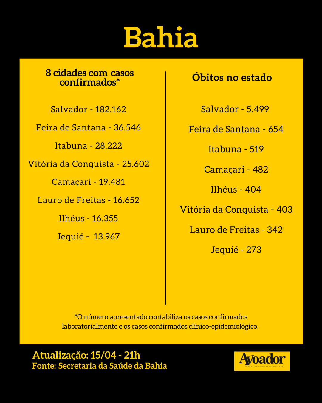 Confira abaixo os dados de Vitória da Conquista, da Bahia, do Brasil e do mundo.
