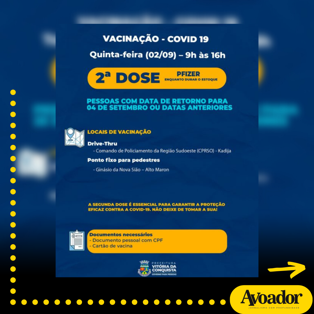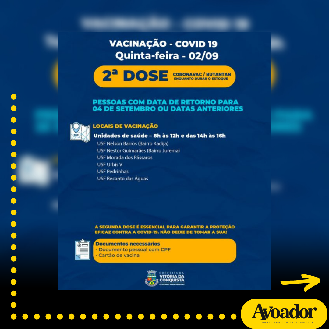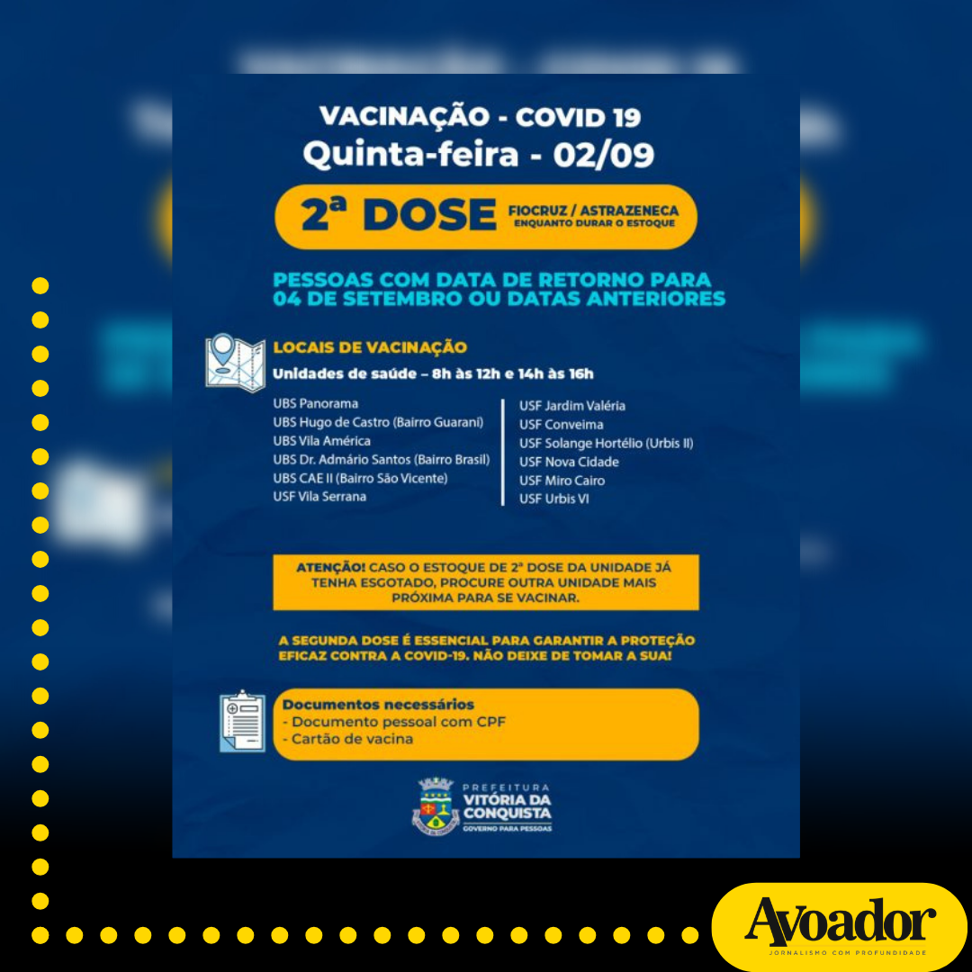 Em Vitória da Conquista, nesta quinta-feira (02/09), a aplicação da primeira dose continua suspensa na cidade. A imunização será realizada apenas na zona rural e nos povoados de Lagoa de Justino, Batalha e Lagoa do Arroz.