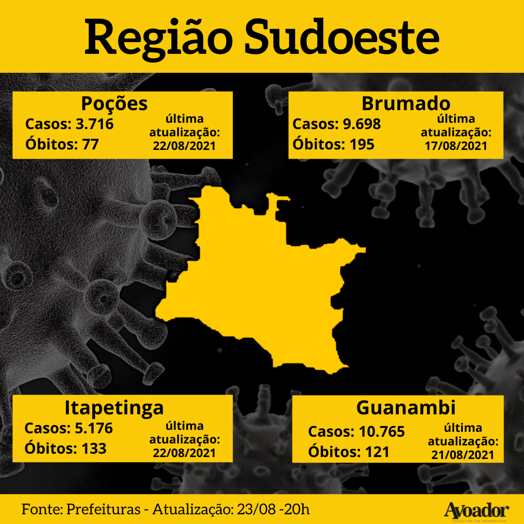 Em Vitória da Conquista, de acordo com o BE da Secretaria Municipal de Saúde, foram registrados 22 novos casos e nenhuma morte. Além disso, 33.889 pessoas que foram infectadas com a covid-19 já estão recuperadas e 152 continuam com o vírus ativo. . Em relação à ocupação de leitos nas unidades de terapias intensivas (UTIs), até o momento, o percentual na cidade é de 46,7%. Há 41 pacientes internados em parte dos 118 leitos disponíveis pelo Sistema Único de Saúde (SUS), dos quais 58 são enfermarias e 60 são leitos de UTIs.