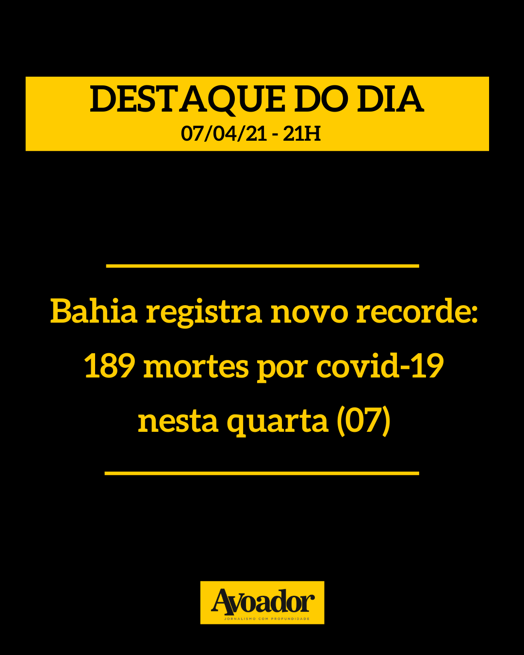 Confira a atualização dos números da covid-19 desta quarta-feira, 7 de abril de 2021 7 de abril de 2021 Mariana OliveiraNesta quarta-feira (07/04), a Bahia registra 189 mortes por covid-19 em apenas 24 horas, o maior número de vidas perdidas desde o início da pandemia. O último recorde ocorreu no dia 31 de março deste ano, com 160 mortes.