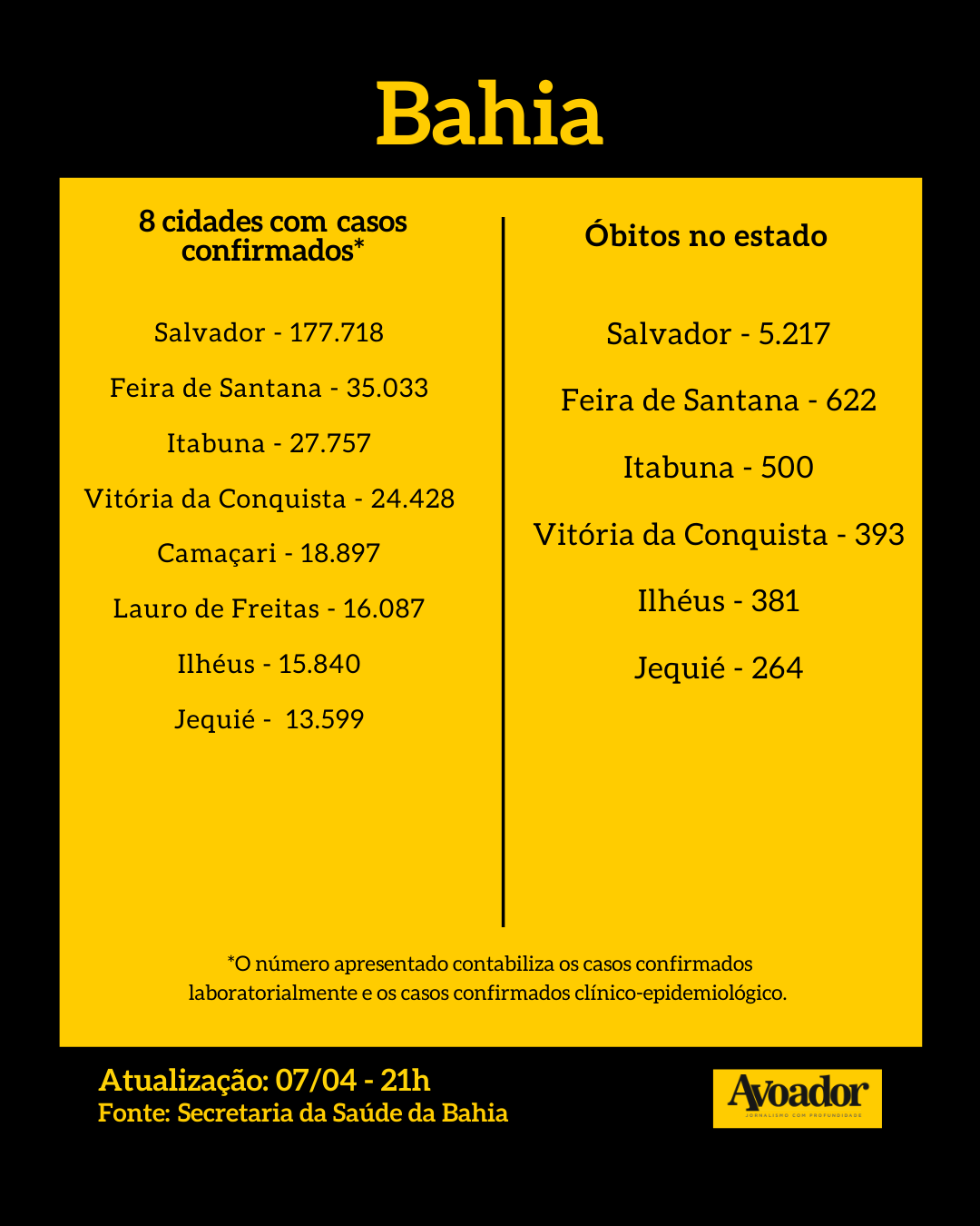 Confira abaixo os dados de Vitória da Conquista, da Bahia, do Brasil e do mundo.