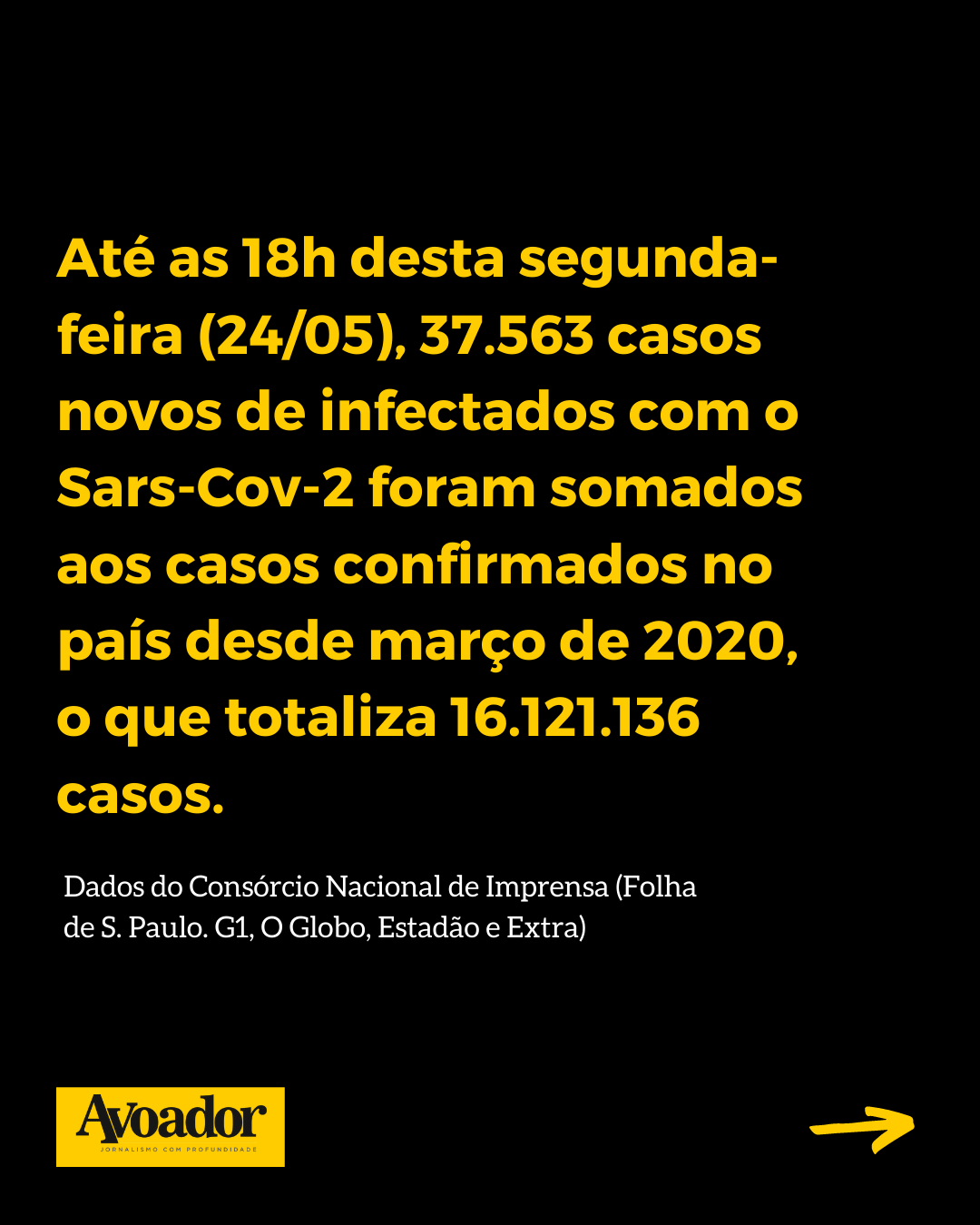 De acordo com o Consórcio Nacional de Imprensa (Folha de S. Paulo. G1, O Globo, Estadão e Extra), 37.563 pessoas foram registradas com covid-19 nesta segunda (24/05), totalizando 16.121.136 casos confirmados da doença desde o início da pandemia. Apesar da média móvel de mortes por dia ter recuado em relação ao nível de março, quando a média ultrapassou 3.100, há quatro meses o país registra mais de 1.000 mortos por dia pela doença.