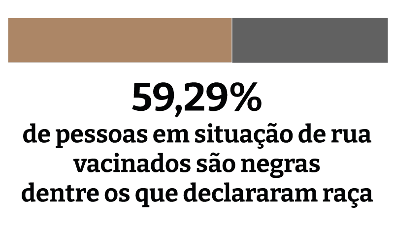 | Dentre os vacinados, há 3 vezes o número de médicos brancos em relação a negros | Dentre os vacinados, há quase 2 vezes o número de pessoas em situação de rua negras em relação às brancas |