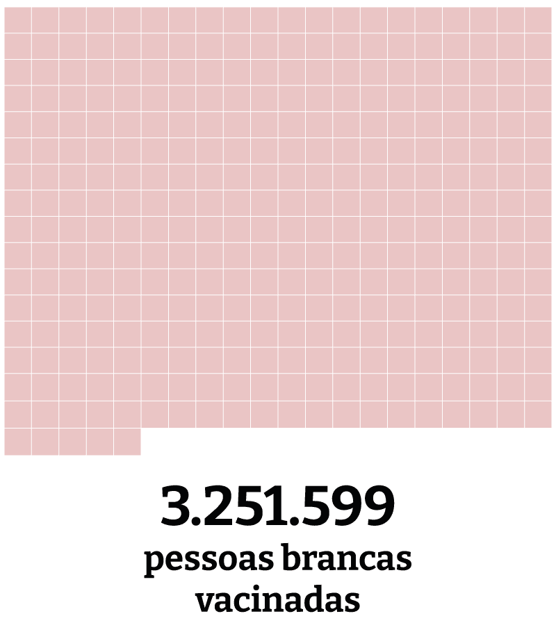 Apesar de a vacinação no Brasil ter se iniciado com uma mulher negra há quase dois meses — a enfermeira Mônica Calazans — hoje há cerca de duas pessoas brancas para cada pessoa negra vacinada. A desigualdade permanece se considerarmos a divisão da população brasileira: há menos negros vacinados em relação à quantidade de brasileiros que se declaram negros quando comparada à população branca que foi vacinada.