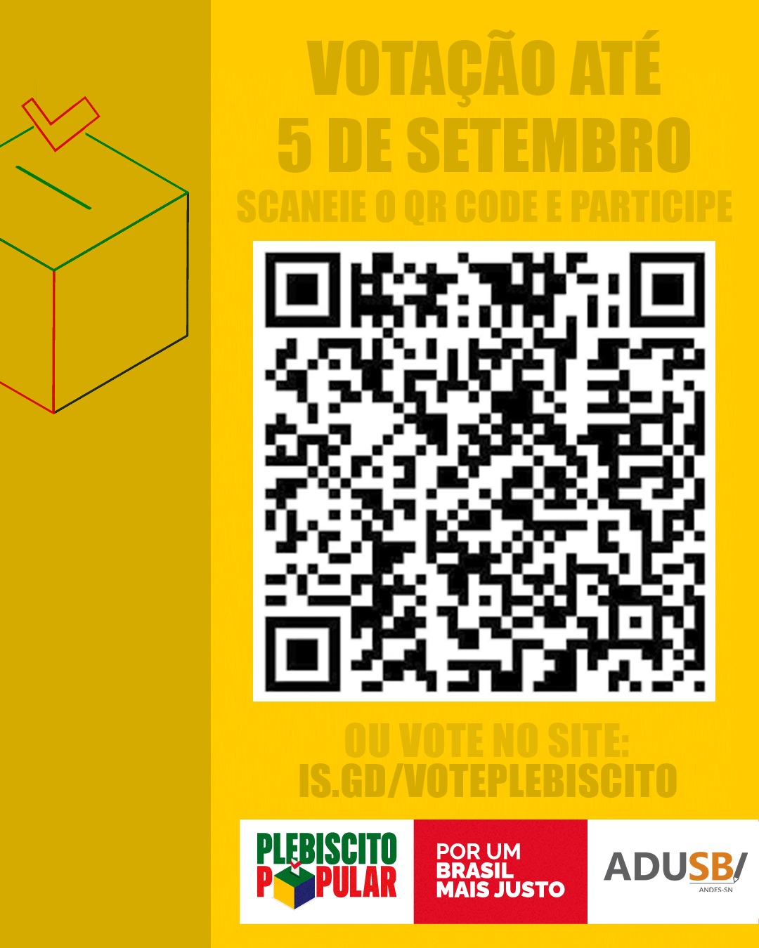 Em Vitória da Conquista, a população pode manifestar seu voto de maneira remota, via QR Code disponibilizado pela Associação dos Docentes da Uesb (Adusb), até o dia 5 de setembro. Também é possível votar presencialmente em uma urna presente no gabinete do vereador Xandó, na Câmara Municipal, localizada na Rua Cel. Gugé, nº 150, no Centro, de segunda a sexta, em horário comercial. Às quartas e sextas, a urna se encontra na entrada do plenário, das 8h30 às 12h.