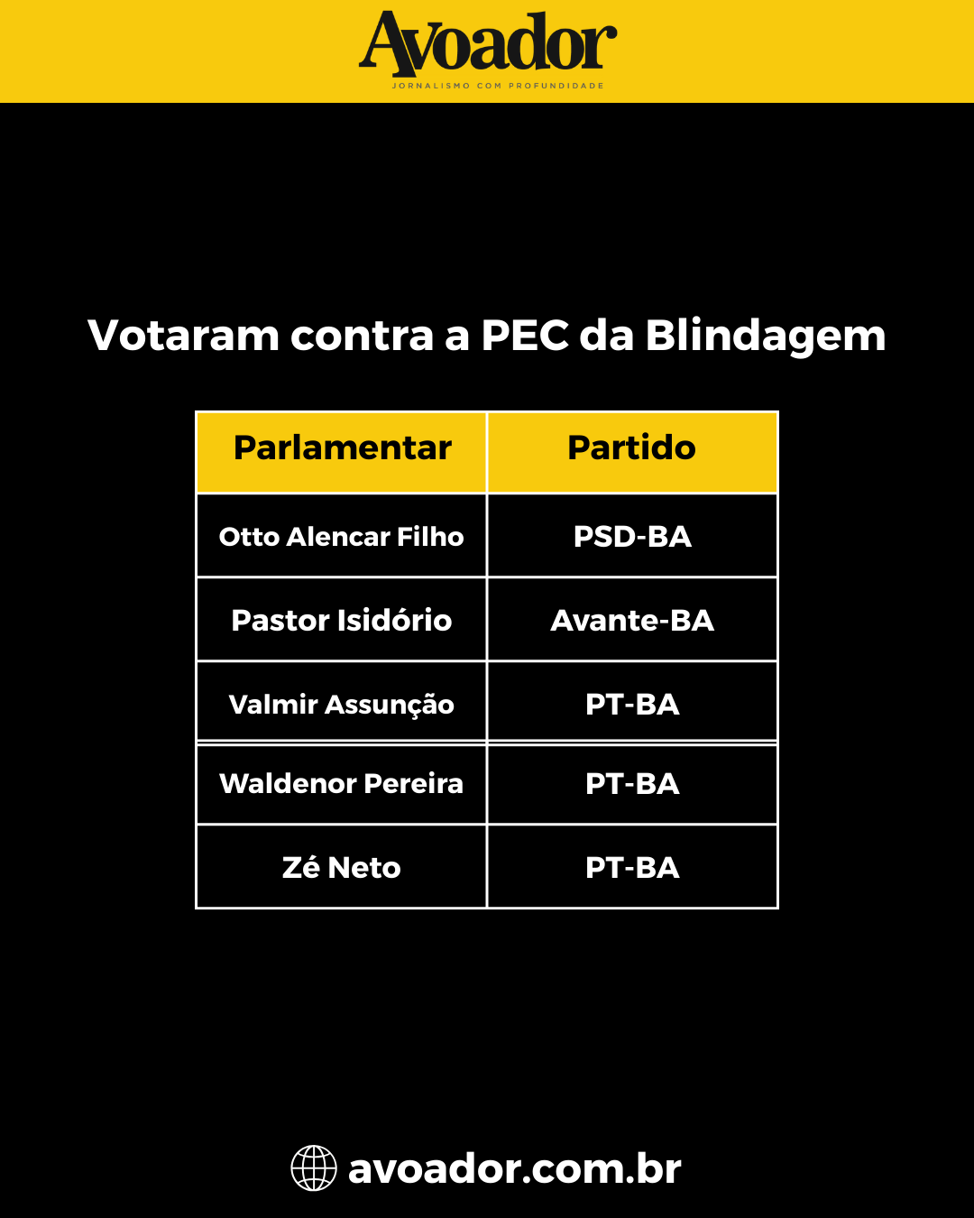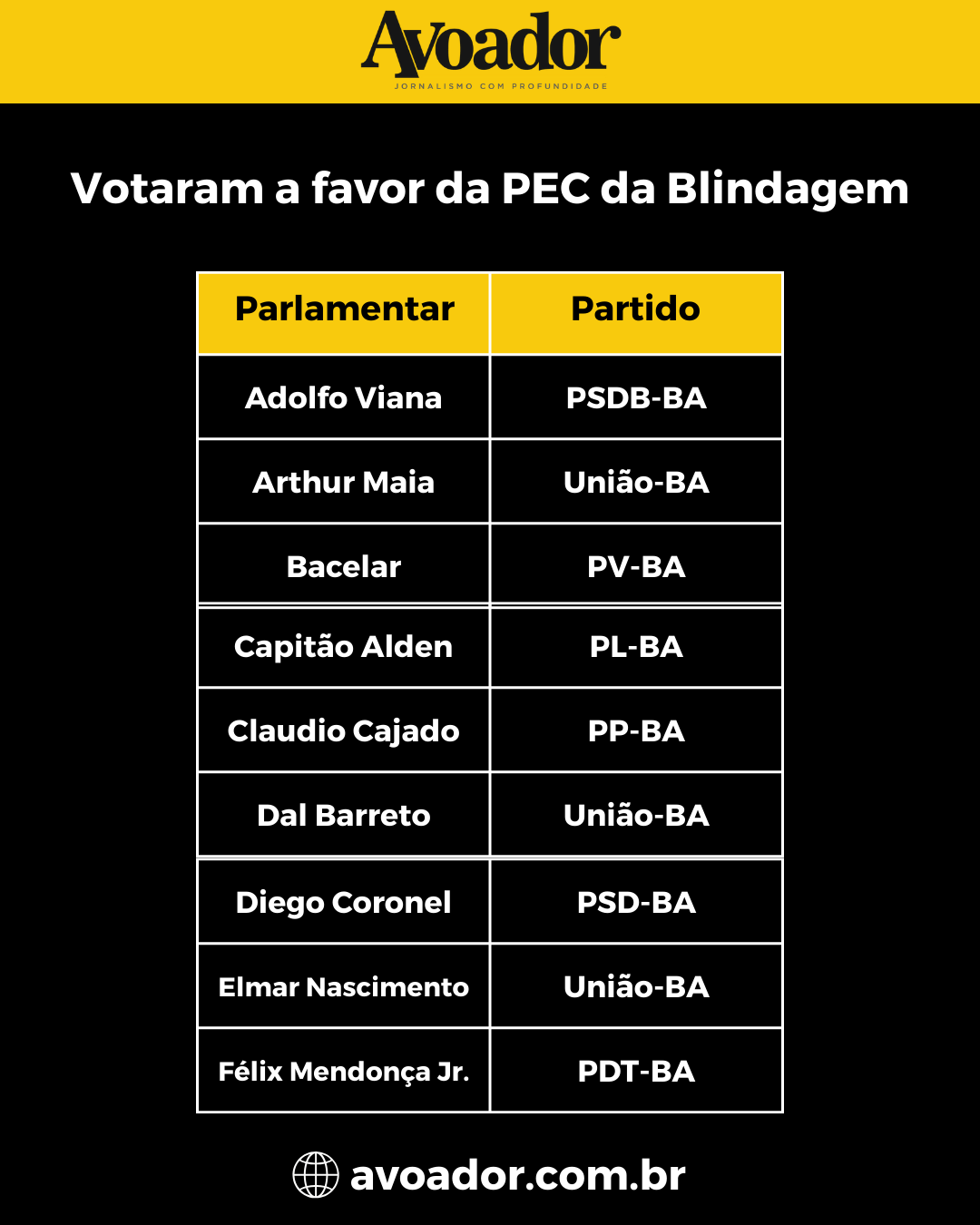 O texto foi aprovado por 344 votos favoráveis e 133 contrários. Dos 39 deputados baianos, 22 votaram sim para o projeto 19 de setembro de 2025 Nanda Deda e Pedro Meireles*A Câmara dos Deputados aprovou, na terça-feira (16/09), em dois turnos, a Proposta de Emenda Constitucional 3/2021, conhecida como PEC da Blindagem, que torna mais difícil a abertura de processos criminais contra parlamentares. No segundo turno, o texto foi aprovado por 344 votos favoráveis e 133 contrários.