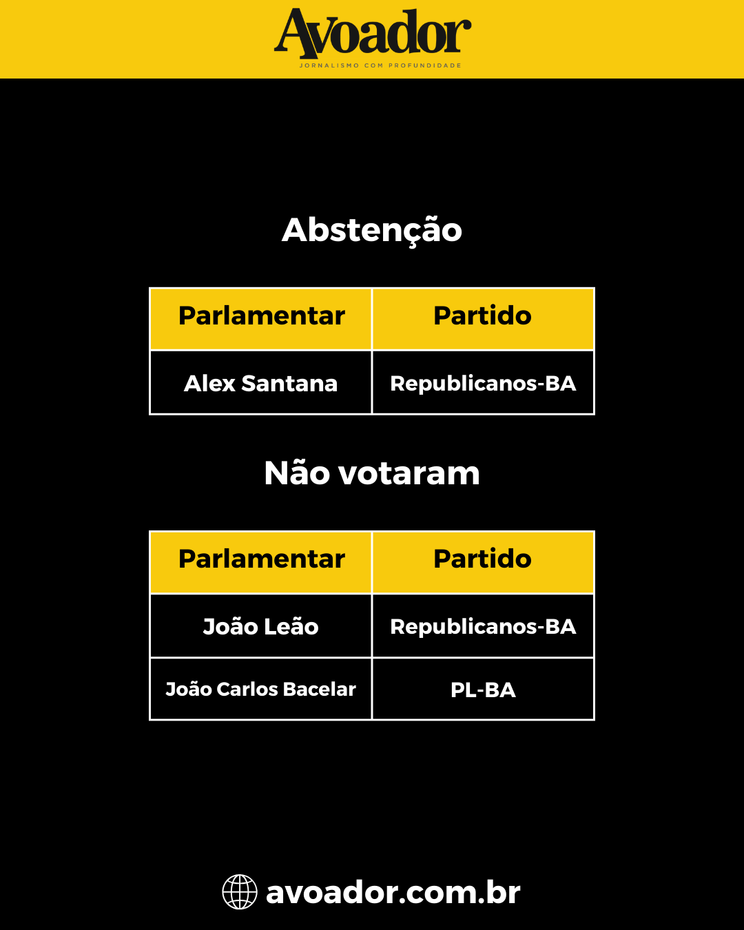 Dos 39 deputados baianos, 22 votaram sim e 14 disseram não. Confira a lista a seguir:
