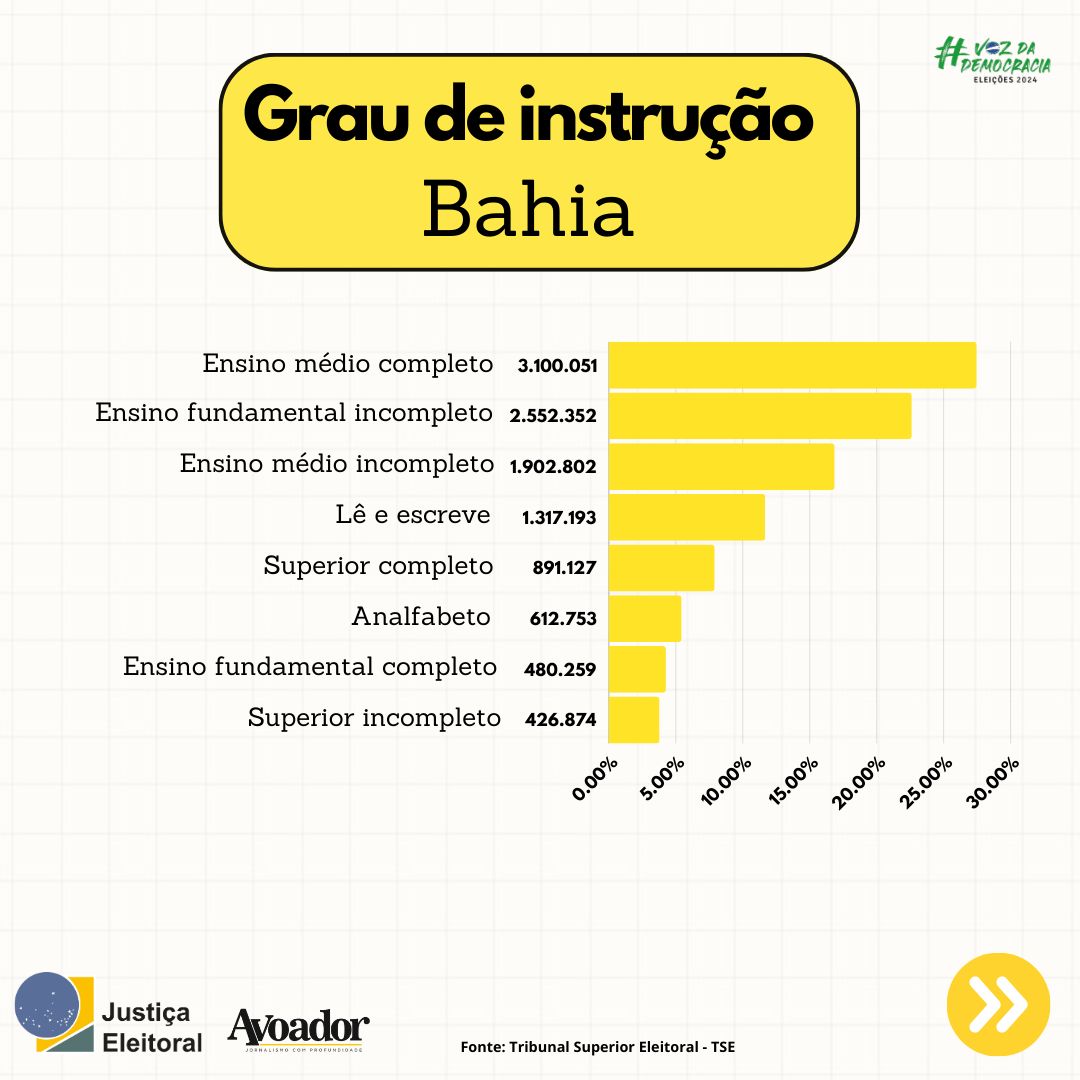 Na Bahia, 2.706 pessoas usarão o nome social para votar, sendo 101 em Conquista. Em termos de escolaridade, 27,47% dos eleitores baianos têm ensino médio completo, 7,9% possuem ensino superior completo, e 5,43% são analfabetos. Na capital da região da Sudoeste, 26,91% dos eleitores têm ensino médio completo, 10,41% possuem ensino superior completo, e 3,59% são analfabetos.