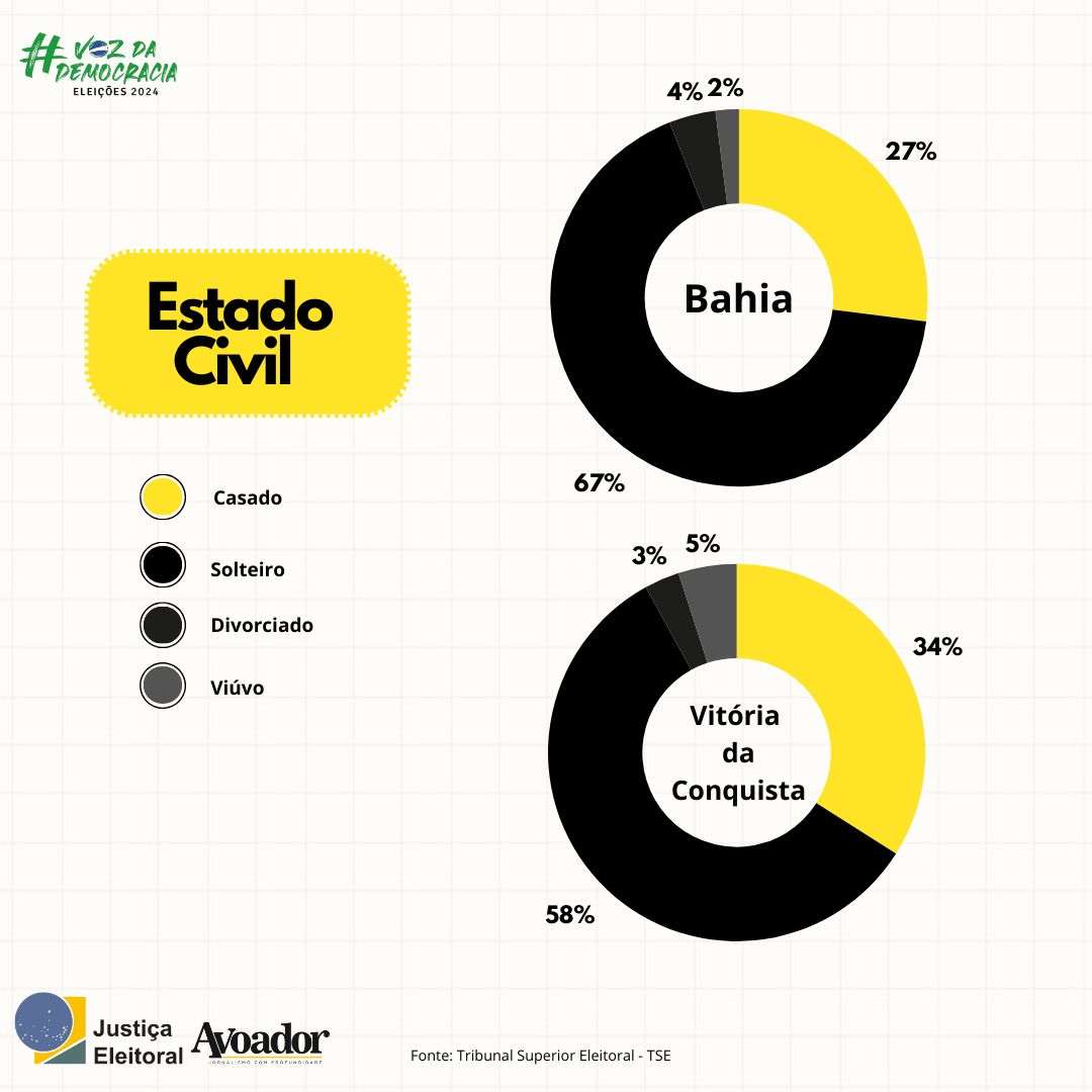 Além disso, 27% do eleitorado baiano (3.102.250 pessoas) são casados, enquanto em Conquista essa proporção é de 34%, totalizando 88.467 eleitores com união estável. Solteiros representam 58% dos eleitores dos moradores da capital da região sudoeste.