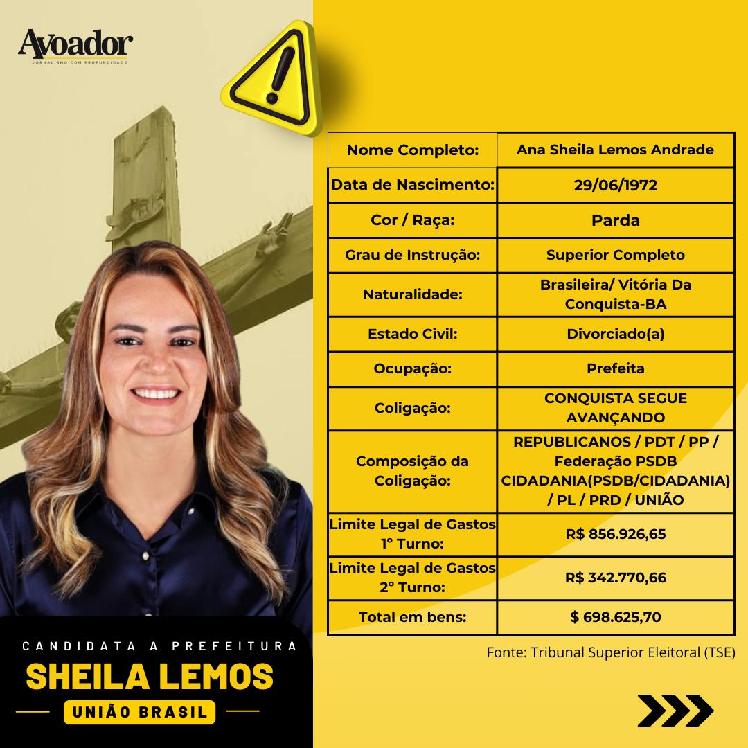 A candidata à reeleição, a prefeita Ana Sheila Lemos Andrade, nasceu, em Vitória da Conquista, no dia 29 de junho de 1972. Ela declarou-se parda e declarou ter em bens R$698.625,70.