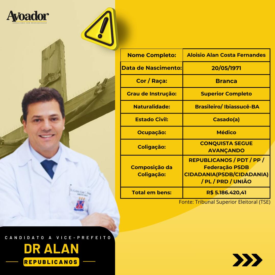 O candidato a vice-prefeito, Aloisio Alan Costa Fernandes, nasceu em 20 de maio de 1971, em Ibiassucê, Bahia. Ele declarou ser branco, médico e ter um patrimônio de R$5.186.420,41.