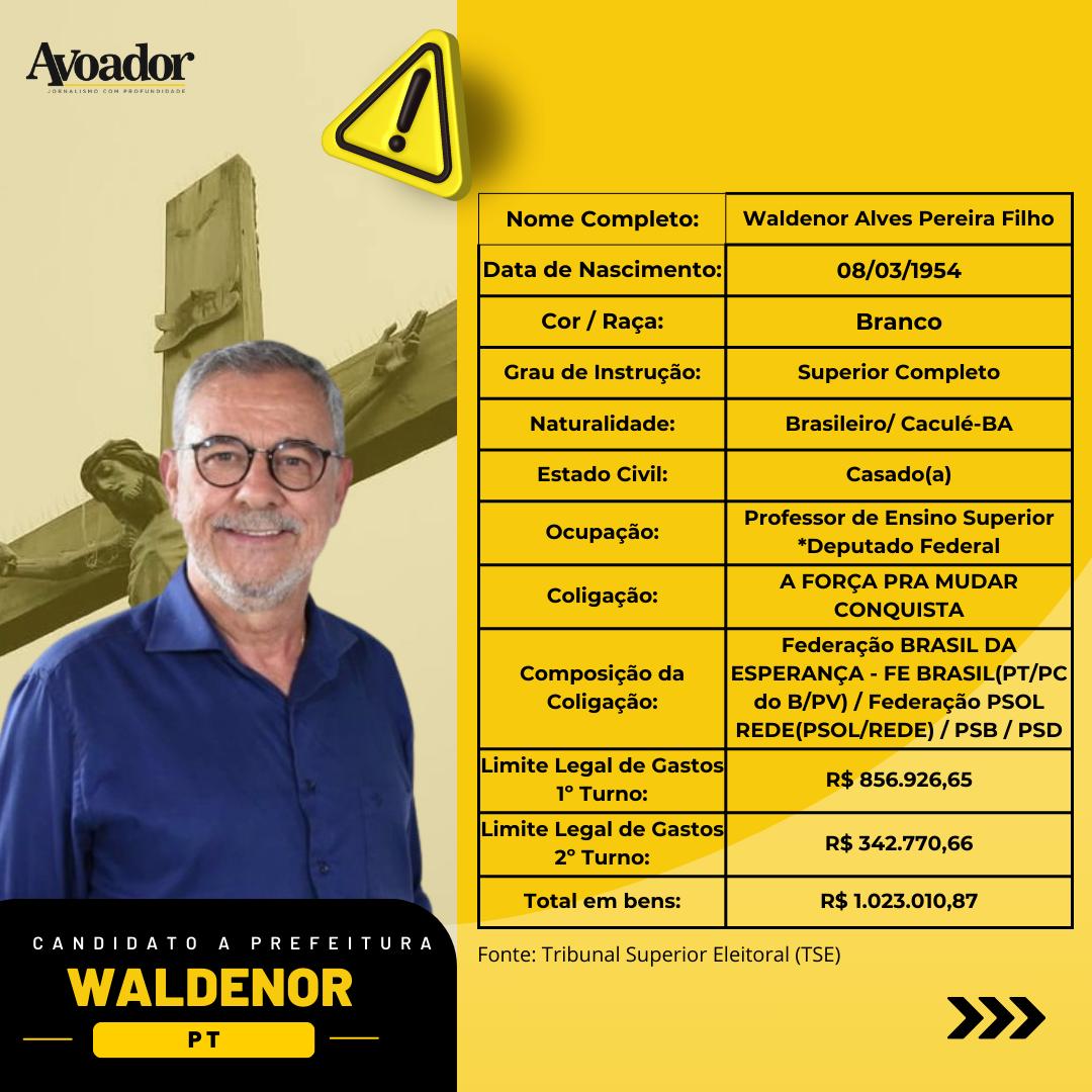 O candidato a prefeito, Waldenor Alves Pereira Filho, nasceu, em Caculé, na Bahia, em 8 de março de 1954. Ele se declarou professor de ensino superior no TSE, mas, em 2002, foi eleito deputado Estadual e, em 2010, ganhou a eleição para o legislativo federal, concorrendo pelo PT. Também registrou ser branco e ter em R$1.023.010,87.