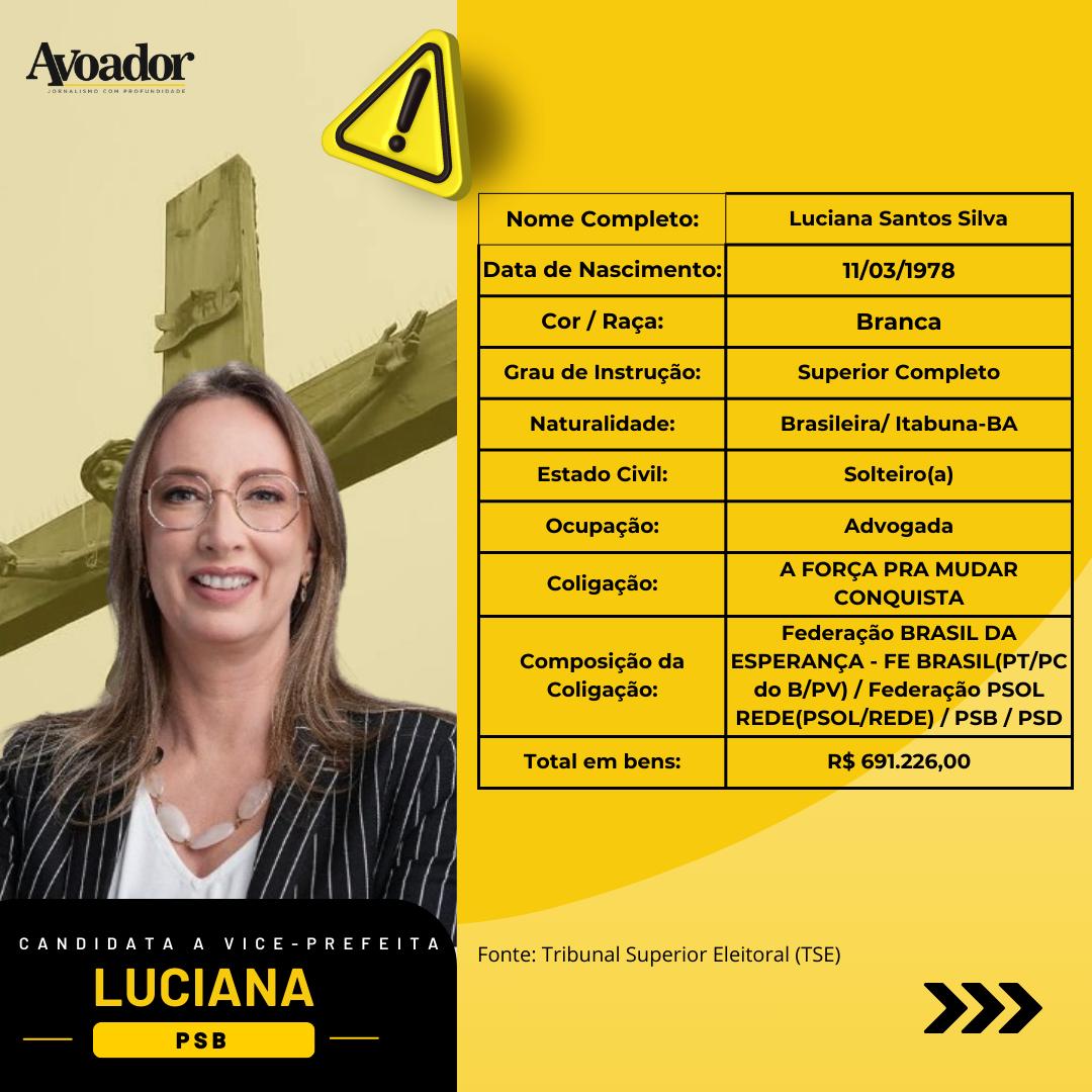 A candidata a vice-prefeita Luciana Santos Silva é de Itabuna, na Bahia, e nasceu em 11 de março de 1978. Ela declarou ser branca, trabalhar como advogada e ter um patrimônio de R$ 691.226,00.