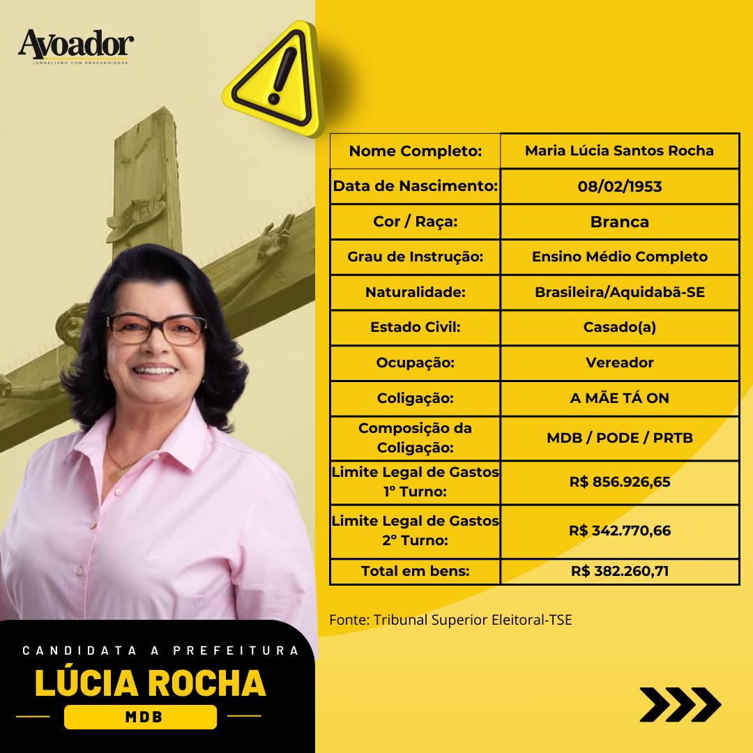 A candidata a prefeita de Conquista, Maria Lúcia Santos Rocha, nasceu em Aquidabã, estado de Sergipe, em 8 de fevereiro de 1953. Ela declarou ser branca, atuar como vereadora e ter um patrimônio de R$382.260,71.