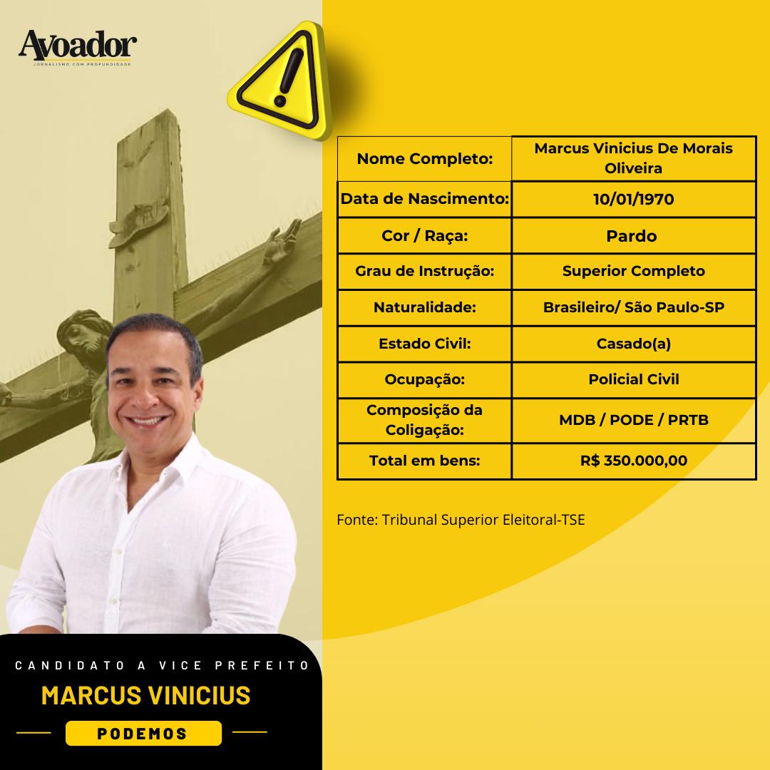 O candidato a vice-prefeito, Marcus Vinicius de Morais Oliveira, é natural da capital São Paulo, em São Paulo, tendo nascido em 10 de janeiro de 1970. Ele declarou ser pardo, trabalhar como policial civil e ter R$ 350.000,00 em bens.