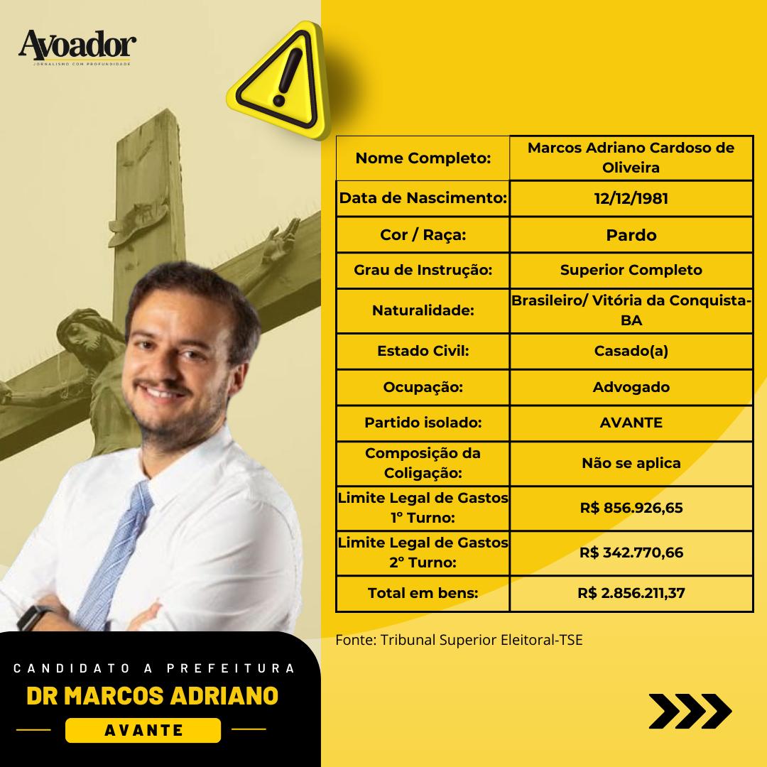 O candidato a prefeito de Conquista, Marcos Adriano Cardoso de Oliveira do Avante, é de Vitória da Conquista, tendo nascido em 12 de dezembro de 1981. Ele declarou ser branco, atua como advogado e ter R$2.856.211,37 em bens.