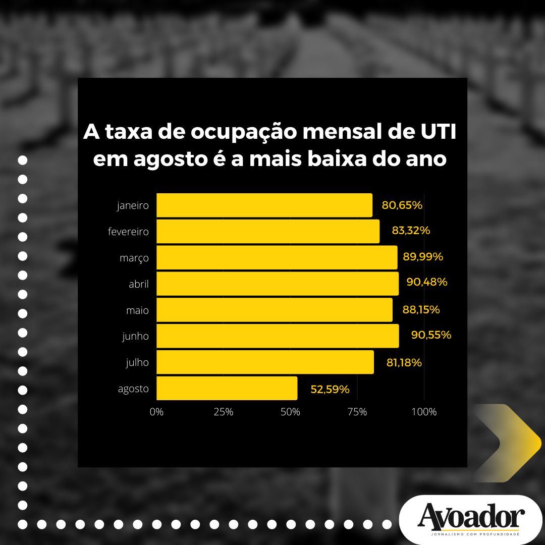 Até o momento deste mês de agosto, Conquista tem a menor taxa mensal de ocupação de UTIs (unidades de terapia intensiva) do ano, tendo 52,59% dos leitos ocupados. Na última segunda-feira (09/08), a cidade estava com a taxa de ocupação em 47,1%, que foi a menor taxa registrada nos últimos três meses. A Bahia tem 40% dos leitos de UTIs ocupados, e o Brasil, pela primeira vez desde outubro de 2020, não tem nenhum estado em nível crítico de ocupação de leitos (acima de 80%).