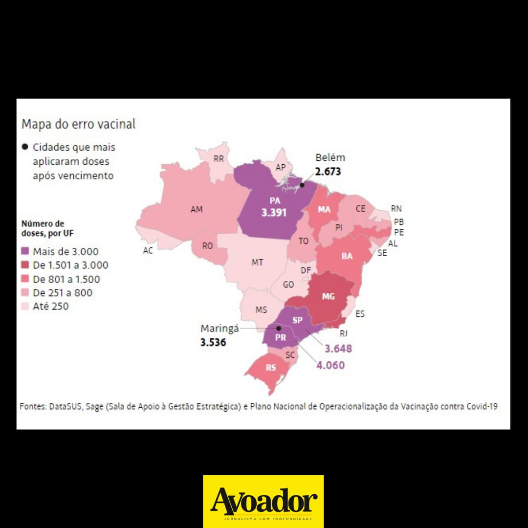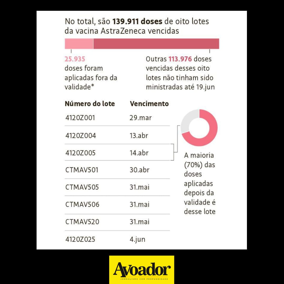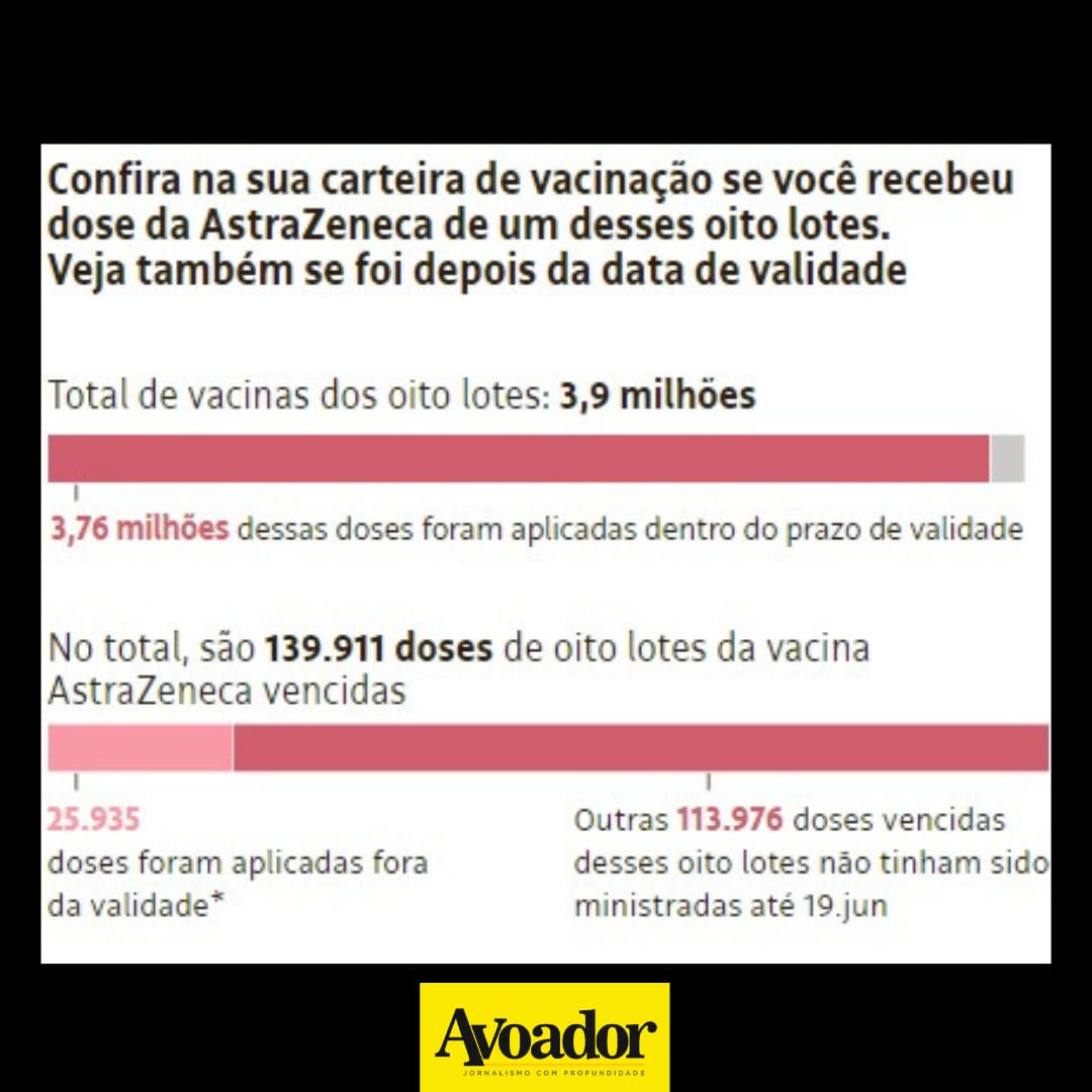 Na Bahia, 114 cidades receberam os lotes do imunizante vencido e aplicaram na população contra a covid-19 2 de julho de 2021 Estêvão Gamba e Sabine Righetti (Folha de S.Paulo)Em reportagem publicada no jornal Folha de S.Paulo nesta sexta-feira (02/07), os repórteres Estêvão Gamba e Sabine Righetti denunciam a aplicação de 26 mil doses vencidas da vacina AstraZeneca em diversos postos de saúde do país. Os dados foram obtidos a partir de registros oficiais do Ministério da Saúde.