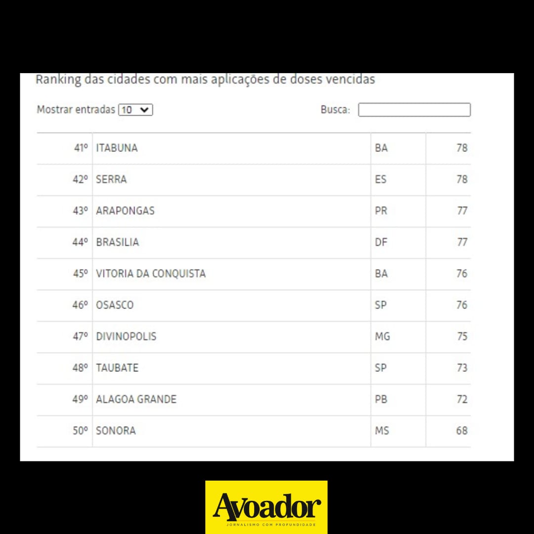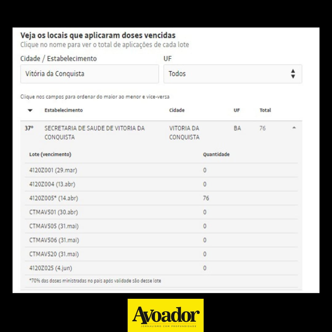 Até o dia 19 de junho, os imunizantes com o prazo de validade expirado haviam sido utilizados em 1.532 municípios brasileiros. Vitória da Conquista é uma das 114 cidades baianas que recebeu esses lotes vencidos. Na matéria jornalística, Conquista aparece com 76 doses aplicada do imunizante com o prazo de validade expirado e está em 46ª lugar entre as cidades onde o problema foi constatado