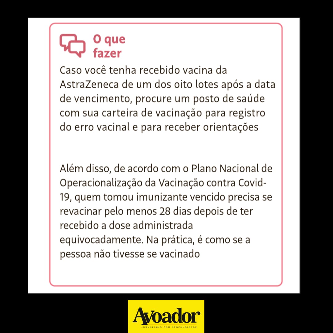 O lote pode ser conferido na carteira individual de vacinação. Quem tiver recebido uma dose de um desses oito lotes de AstraZeneca após a data de validade (veja gráfico) deve procurar uma unidade de saúde para orientações e acompanhamento.