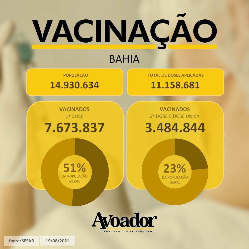 Já no estado da Bahia, desde que a imunização contra a covid-19 começou, no dia 19 de janeiro, 7.673.837 pessoas foram vacinadas com a primeira dose dos imunizantes disponíveis, esse número equivale a 51% dos 14.930.634 habitantes do território baiano. Já a população totalmente vacinada com a segunda dose e dose única é de 3.484.844 indivíduos, representando 23% dos moradores.
