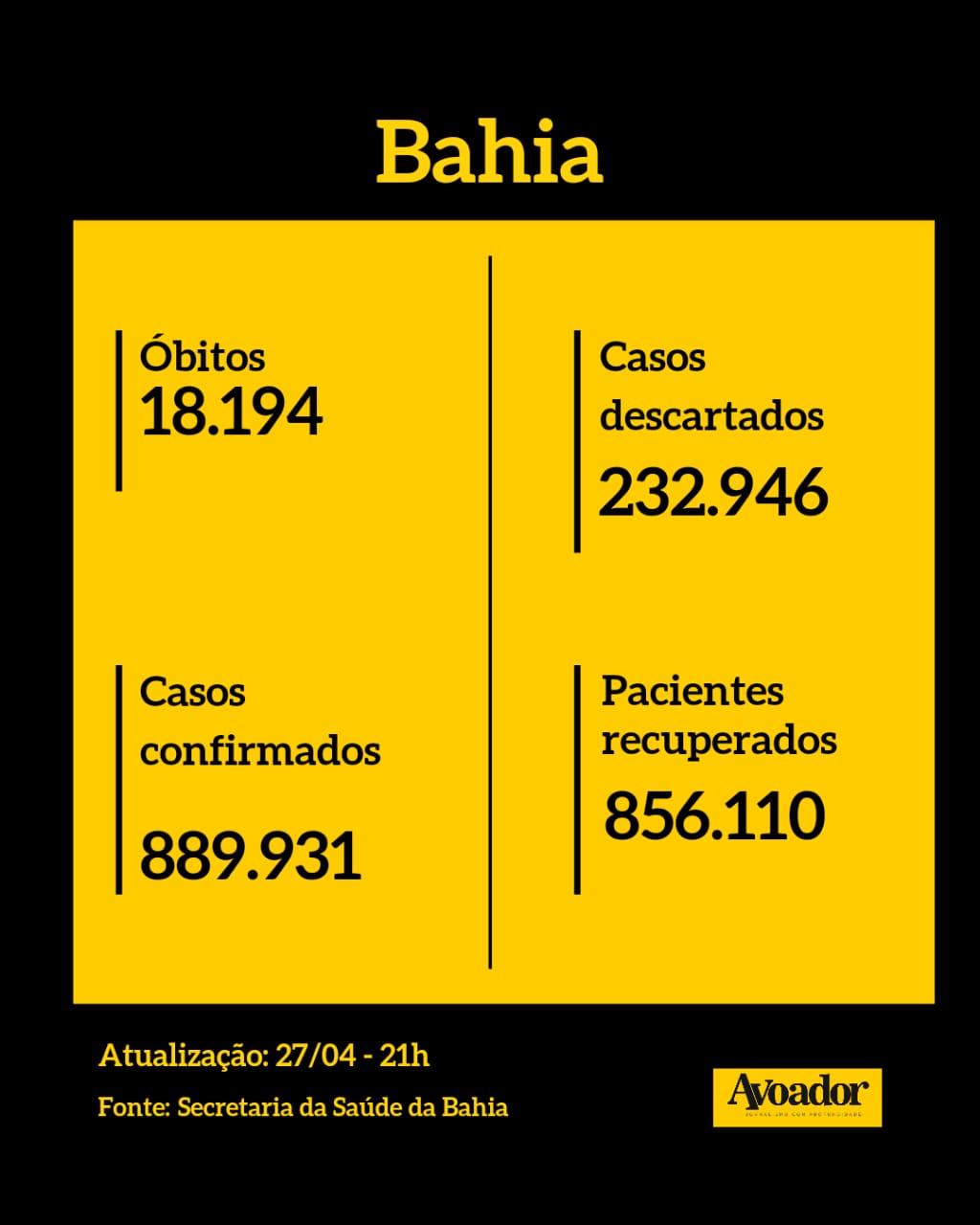 Conferira abaixo os dados do mundo, do Brasil, da Bahia e de Vitória da Conquista.