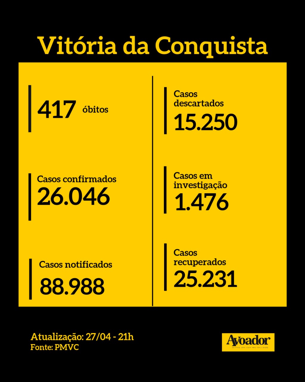 27 de abril de 2021Vitória da Conquista registrou, nesta terça-feira (27/04), mais três mortes por covid-19. São agora 417 vidas perdidas desde o início da pandemia na cidade.