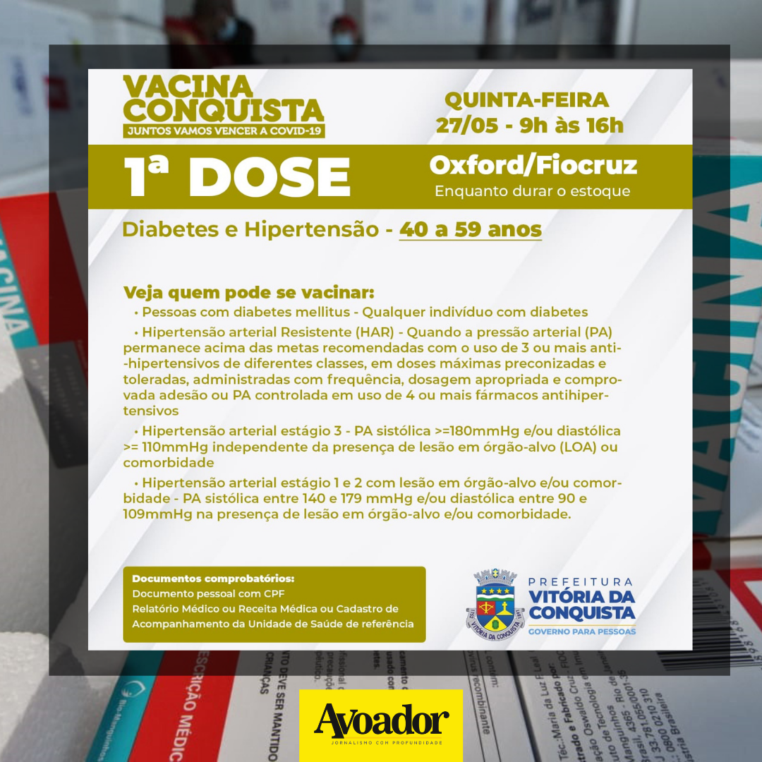 Haverá continuidade da vacinação para os trabalhadores da educação com idade entre 40 a 59 anos que atuam em Conquista; também para qualquer pessoa, entre 40 a 59 anos, com Diabetes Mellitus ou Hipertensão; quem tiver entre 18 a 59 anos seja transplantado ou tenha Síndrome de Down e Imunossupressão. Os primeiros devem apresentar o contracheque e os demais precisam levar o relatório médico e/ou receita médica para garantir a vacinação.