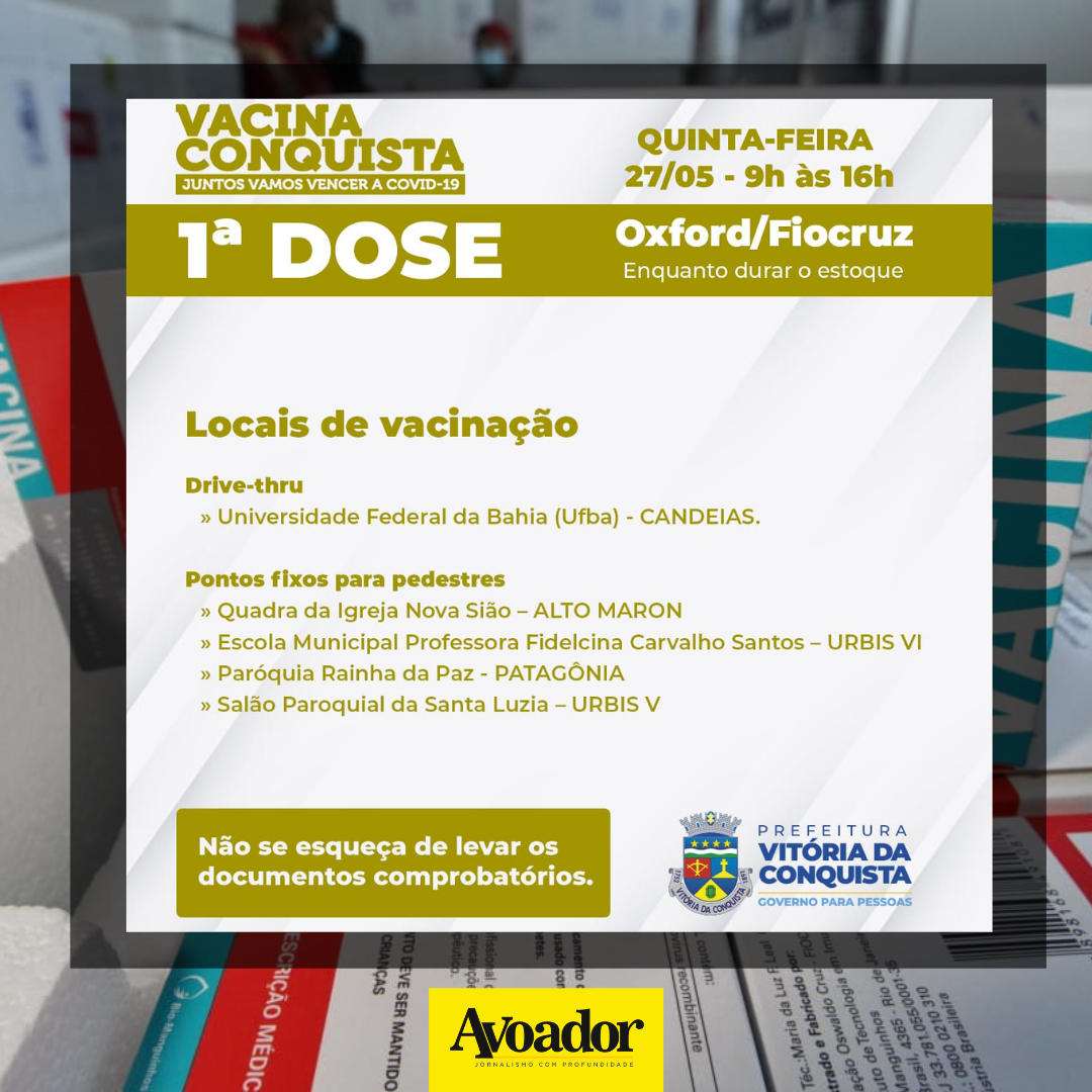 A primeira dose da vacina de Oxford/Fiocruz estará disponível, de 9h às 16h, no drive-thru da Ufba e nos pontos fixos para pedestres da quadra da Igreja Nova Sião, Escola Municipal Professora Fidelcina Carvalho Santos, Paróquia Rainha da Paz e Salão Paroquial da Santa Luzia.