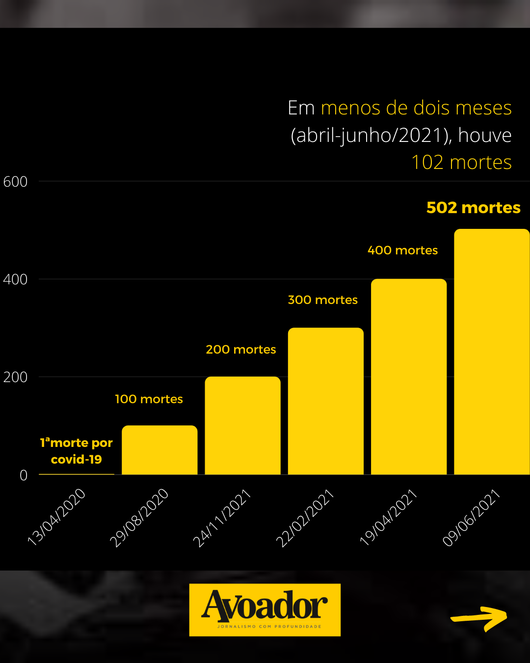 Confira a atualização dos números da covid-19 desta quarta-feira, 09 de junho de 2021 10 de junho de 2021 Mariana OliveiraCom mais três vidas perdidas nos últimos três dias (7, 8 e 9 de junho) e registradas hoje (09/06), Vitória da Conquista registra 502 mortes por covid-19. Nesta semana, em apenas três dias, o município registrou nove óbitos causados pela doença pandêmica. No dia 19 de abril deste ano, a cidade marcou 400 mortes, o que demonstra que em menos de dois meses, 102 pessoas morreram devido ao novo coronavírus.
