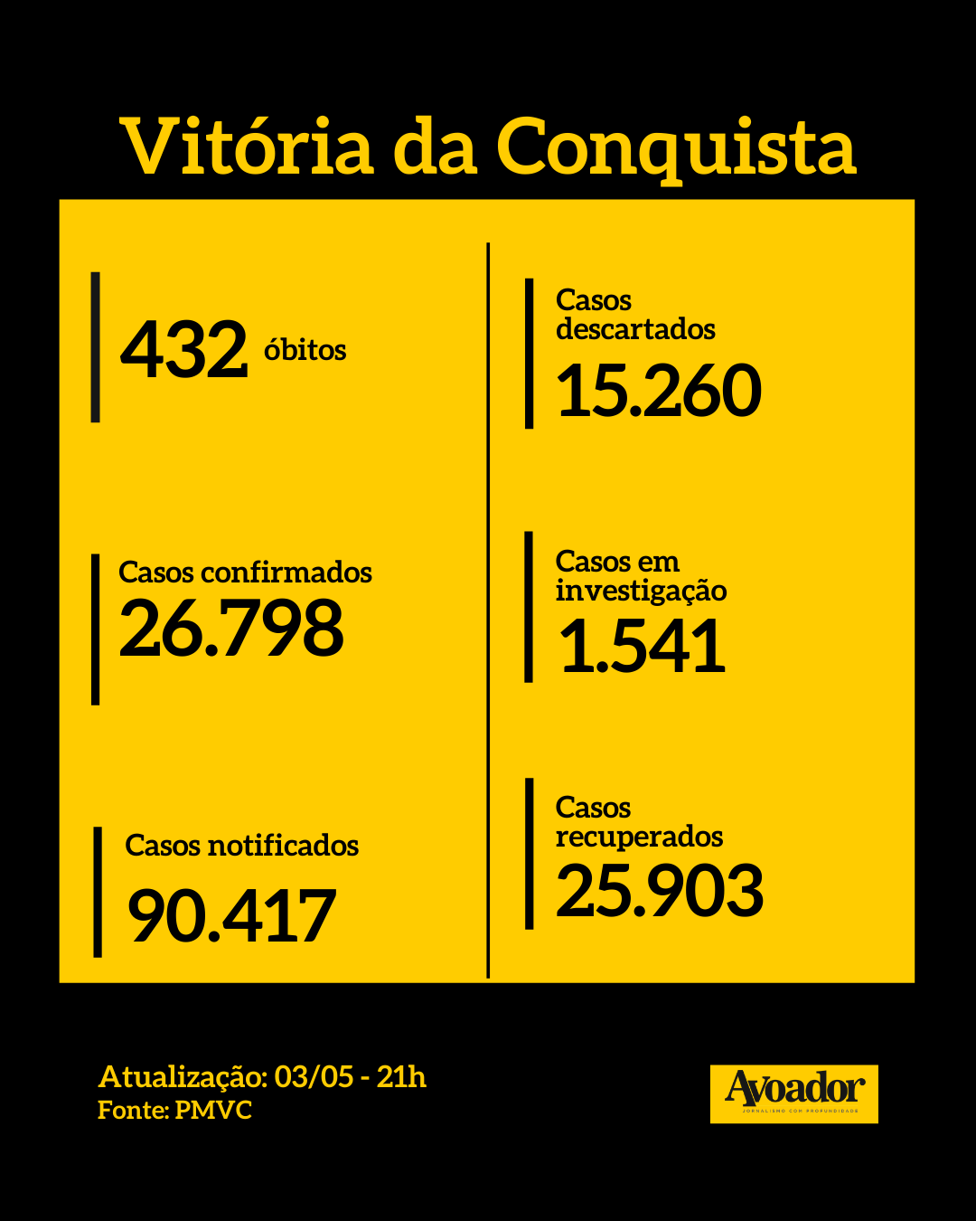 Confira abaixo os dados de Vitória da Conquista, da Bahia, do Brasil e do mundo.