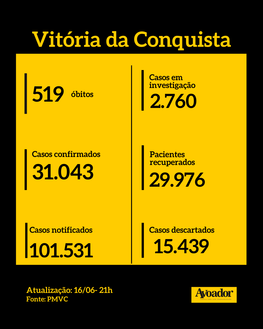 Confira abaixo os dados de Vitória da Conquista, da Bahia, do Brasil e do mundo.