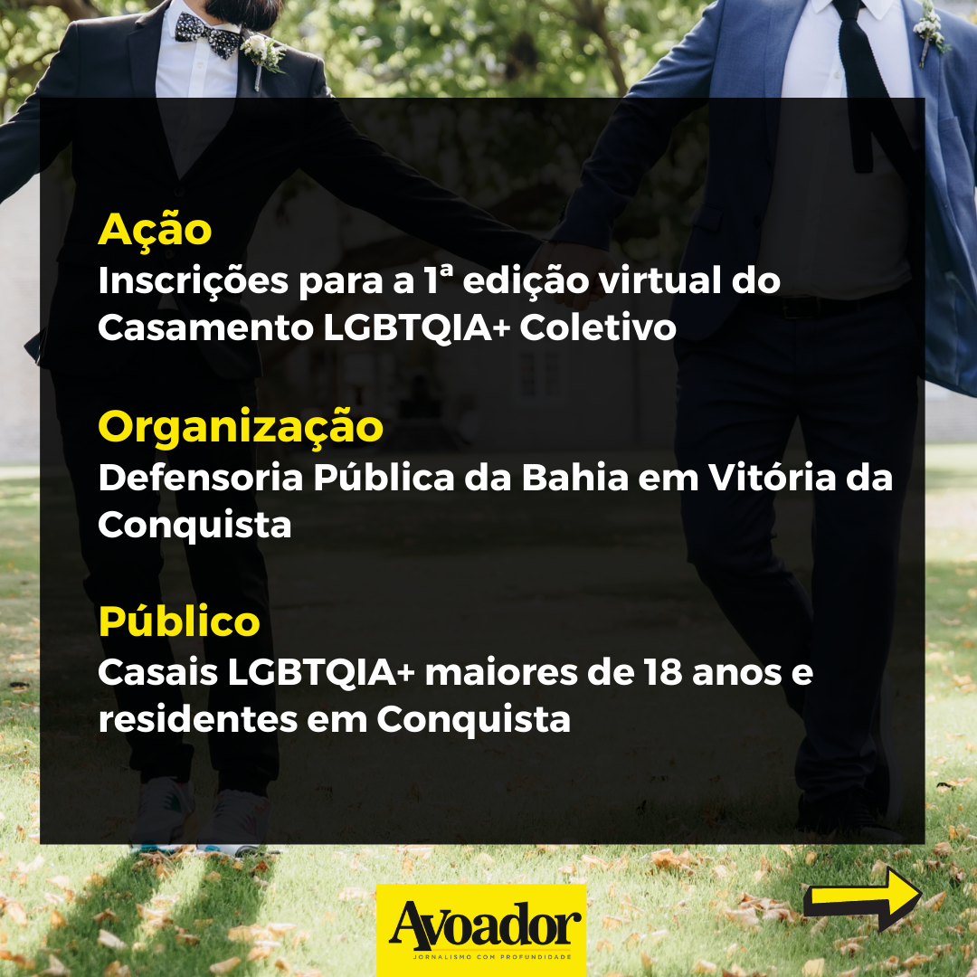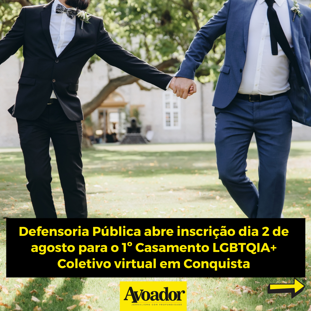 A ação social conta com o apoio da Ouvidoria Cidadã da DPE/BA e da Clínica de Direitos Humanos da Uesb 27 de julho de 2021 Mariana OliveiraA partir da próxima segunda-feira, 2 de agosto, estarão abertas as inscrições aos casais interessados em participar do Casamento LGBTQIA+ Coletivo em Vitória da Conquista. A ação, organizada pela Defensoria Pública da Bahia (DPE/BA), terá a sua primeira edição virtual.