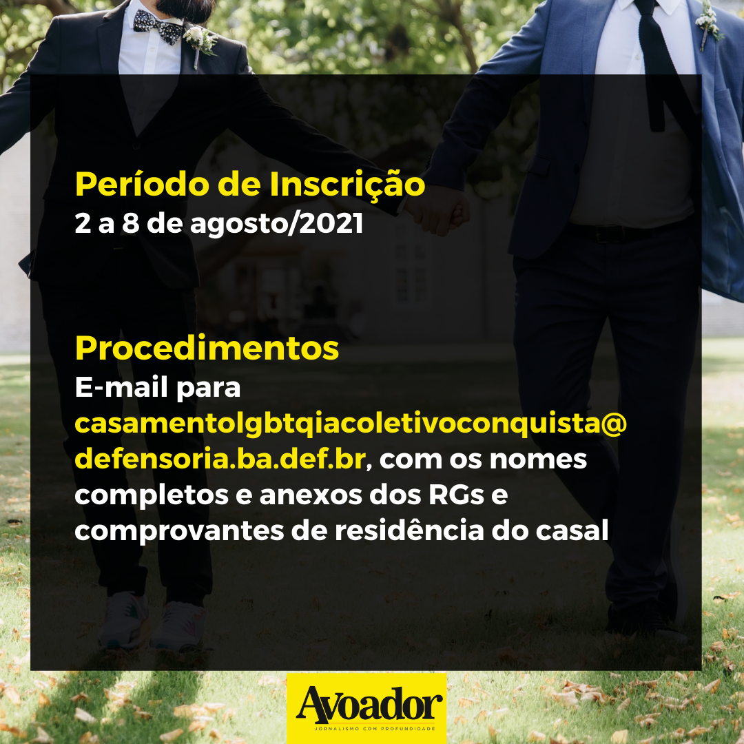 As inscrições serão pelo e-mail: casamentolgbtqiacoletivoconquista@defensoria.ba.def.br e o prazo limite é até o domingo, dia 8 de agosto. É preciso enviar os nomes completos, cópias dos RGs e comprovantes de residência em Conquista de cada um. Entre os inscritos, haverá ainda uma análise dos documentos recebidos pela DPE/BA. Os selecionados serão contatados para providenciarem outras documentações necessárias ao pedido de habilitação do casamento.